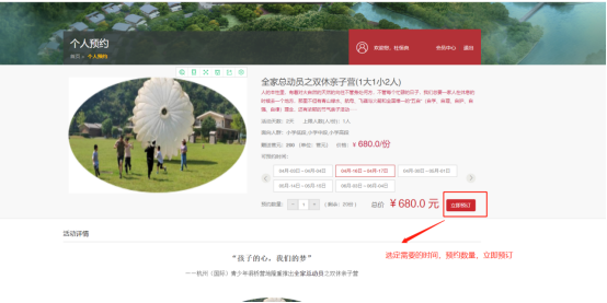 5.按需求选择活动时间,并根据参与人数填写活动份数,点击“立即预订”,进行预定。