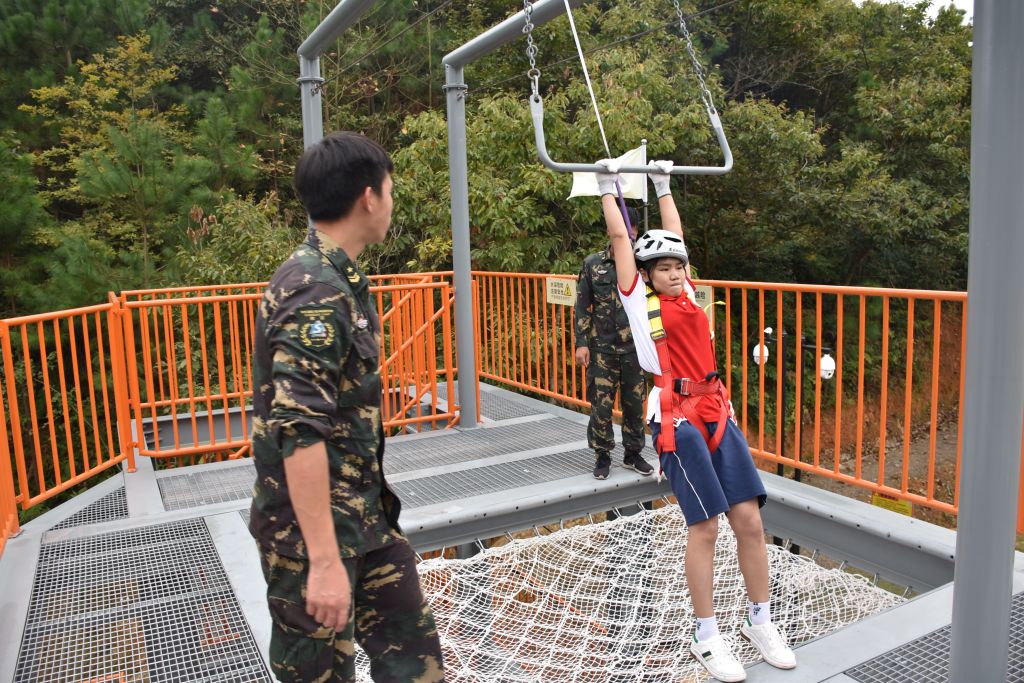 飞身越险器材放置在高空拓展区综合装置三层,设施含跳板(离地6米)以及悬挂抓杠钢丝绳一根,下方设置了优质防坠保护网,开展飞身越险项目还需要使用主锁、钢锁、坐式安全带、安全帽等安全设备,是营地开展国防教育的军事体验类活动设施。 本活动设施实行定时开放管理,可同时容纳1人参加活动,队员可在领队组织下按照活动项目操作流程进行活动体验。期待你,不惧困难增勇气,全力冲关求进取。