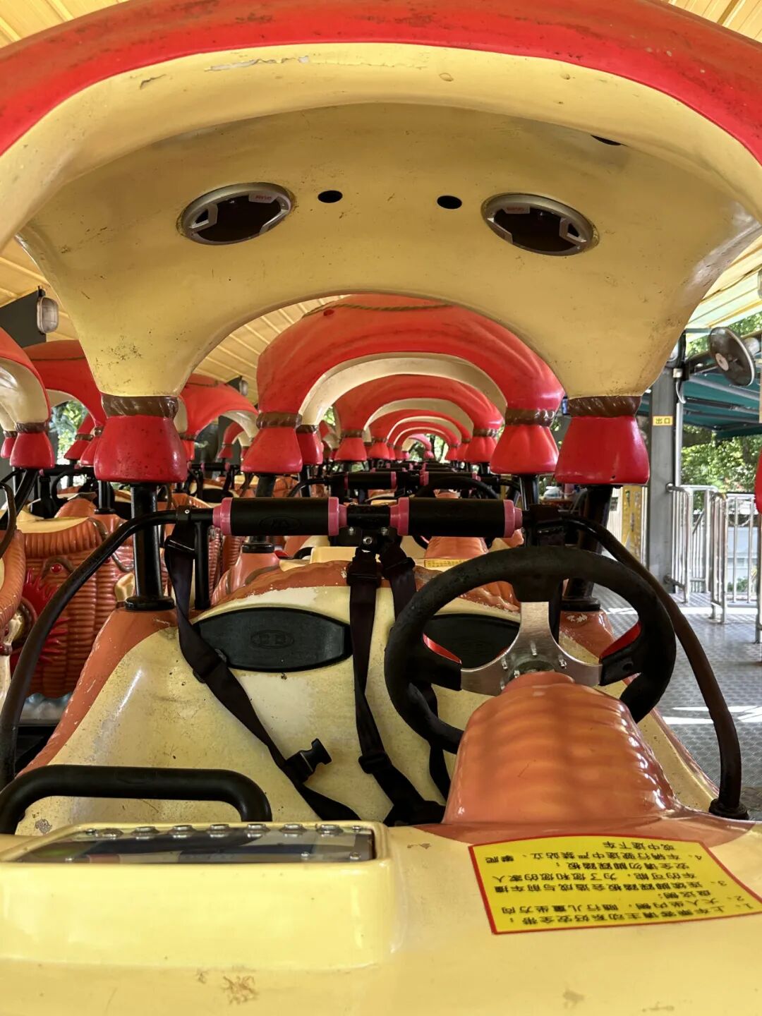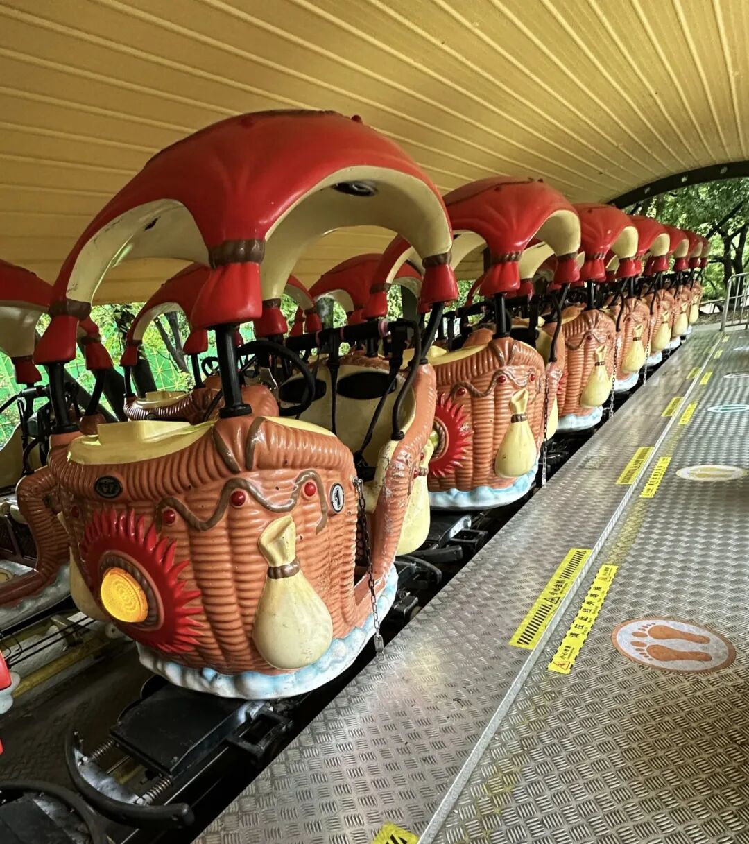 当您进入游玩区域后,请听从我们工作人员的指令并站在所对应的颜色脚印上等候,请照看好您的小孩,不要站上台阶哦!当车辆在你面前停稳后再上车。