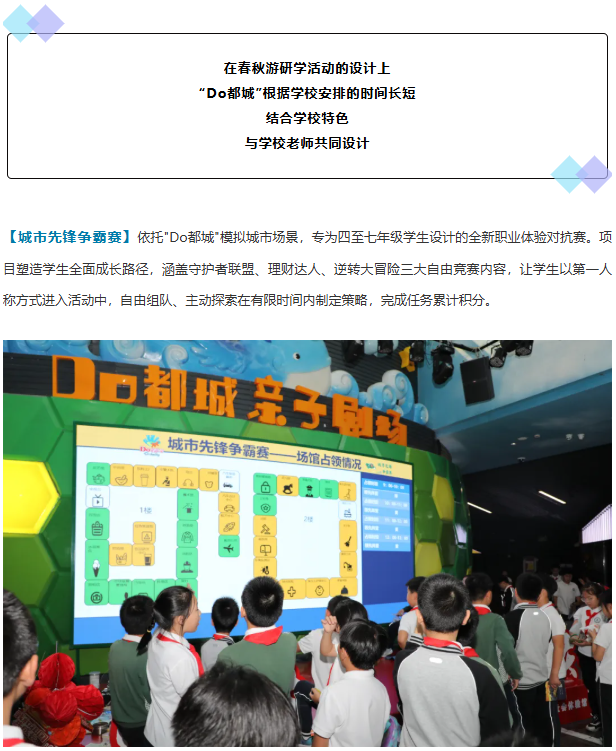 近期,来自杭州濮家小学教育集团、杭州市滨江实验小学、杭州市富阳区富春第五小学等2500多名学生,在“Do都城”内开展了“小职业 大梦想”为主题的秋游活动,通过参与不同主题、形式的综合实践活动,收获满满,度过快乐的时光。