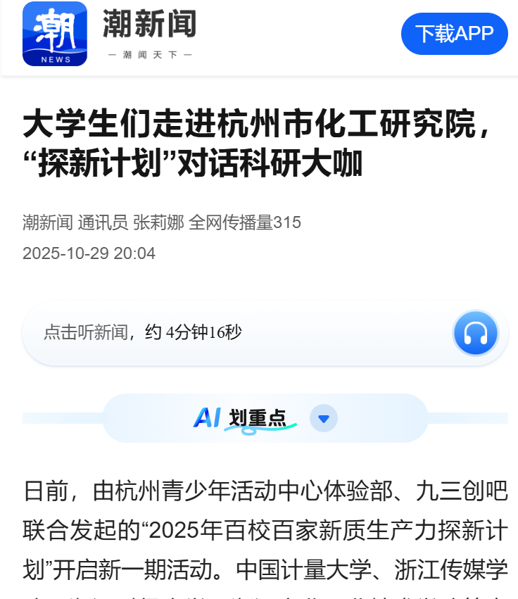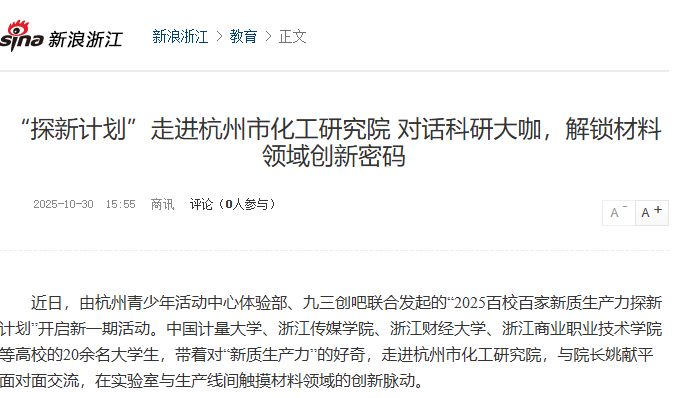 潮新闻、新浪浙江等报道“Do都城”探新计划活动走进杭州市化工研究院