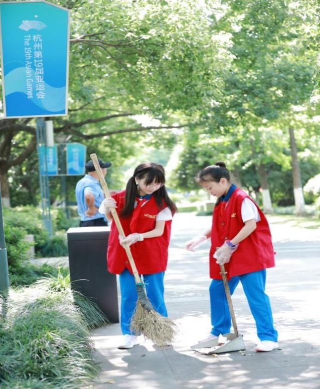 这个假期,杭州少儿英语俱乐部的红领巾双语志愿者们还走进社区、体育公园等公共场馆,以小队为单位,为亚运服务。在小队长张艺的号召下,队员们相约一起来到了城北体育公园,集中清理了公园游乐场、公共道路和绿化等公共区域的各类垃圾。活动现场,大家分工明确,组织有序,手持清洁工具,积极清扫道路树叶,捡拾垃圾,分类倒入垃圾箱,为可持续发展助力,路人们纷纷为队员们的表现点赞。