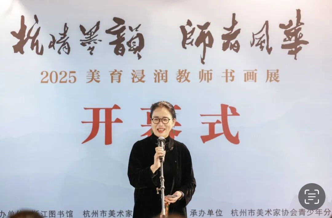 11月15日下午,由浙江图书馆、杭州市美术家协会联合主办,杭州市美术家协会青少年分会承办的“‘杭’情墨韵 师者风华——2025美育浸润教师书画展”,在浙江图书馆(曙光路馆)一楼展厅举行开幕式。杭州市文学艺术界联合会秘书长程育青,杭州市基础教育研究室美术教研员、中国美术家协会会员李方,杭州市美术家协会副主席兼青少年分会主席高甬春,以及分会副主席,分会创作辅导委员会副主任,秘书长等领导和嘉宾出席开幕式,与近百位参展教师、艺术爱好者共赴这场初冬的艺术之约。
