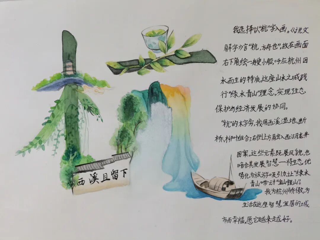 笔绘青山绿水,书写美好生活。值此“绿水青山就是金山银山”理念提出20周年之际,杭州青少年活动中心文学部举办了“山水杭州见美好”杭州市童心绘汉字创意秀大赛。