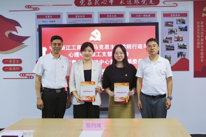 第二个阶段是“党建联建互促共进”。2025年6月9日上午,支部与浙江工商大学马克思主义学院行政与心理中心教工党支部在杭州(国际)青少年洞桥营地(以下简称“营地”)就营校资源共享、活动开展共谋、教育研究共探、队伍建设共促等方面进行深入交流讨论并签署了《党建联建协议书》。