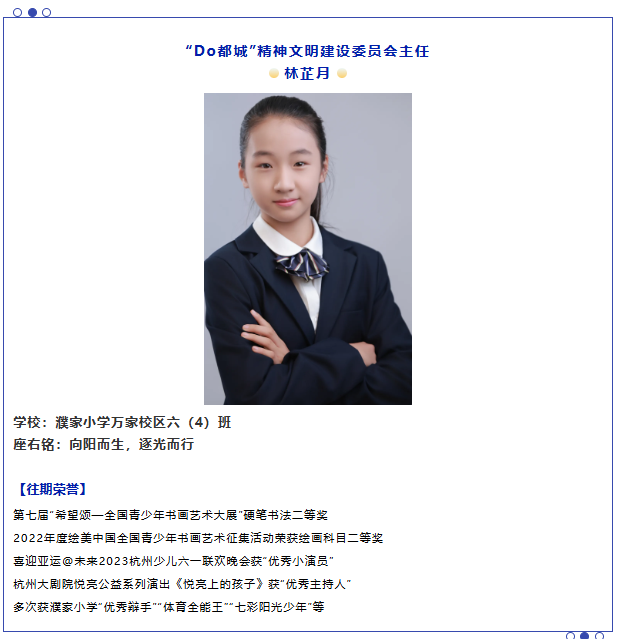 林芷月既是书画赛场上的“小艺术家”,也是田径场上的“拼搏小将”;她曾在全国书画比赛中屡获佳绩,也曾在辩论台前侃侃而谈、在公益舞台上落落大方。静能执笔绘梦,动能跨越前行——这份多元的热爱与综合的素养,照亮了她的成长之路。