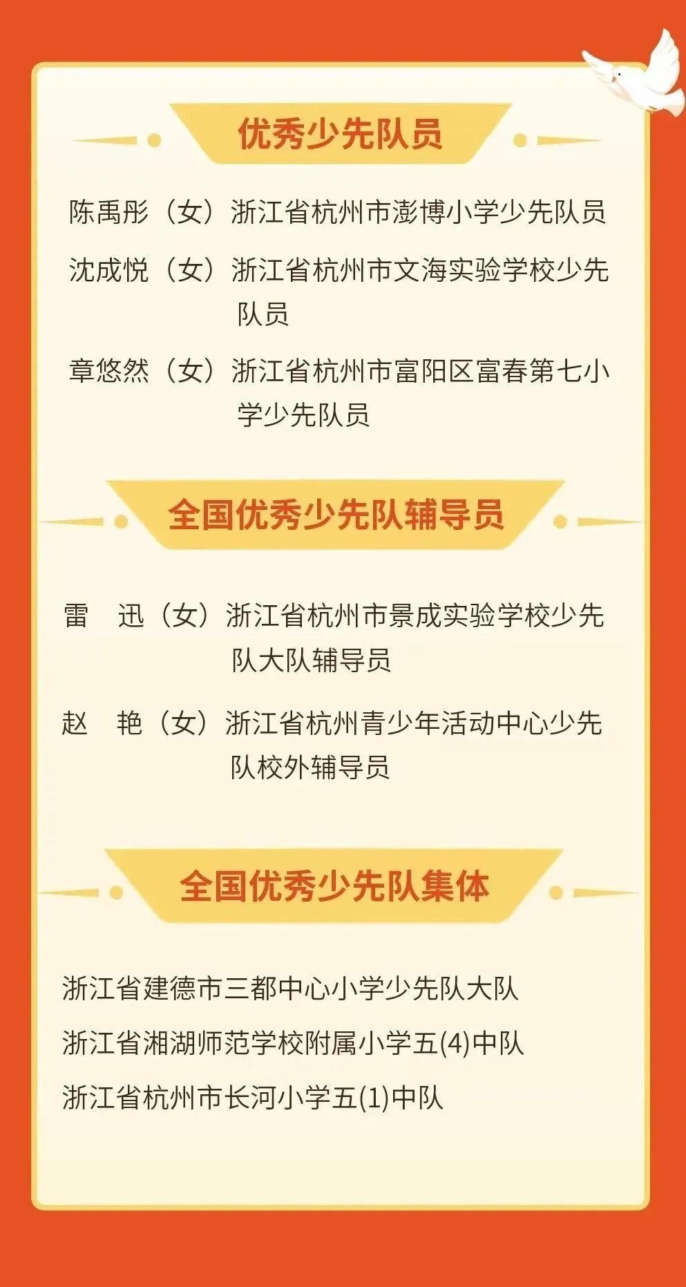 获奖名单中,杭州共有3名少先队员荣获“全国优秀少先队员”称号,2名少先队辅导员荣获“全国优秀少先队辅导员”称号,3个少先队大、中队荣获“全国优秀少先队集体”称号。