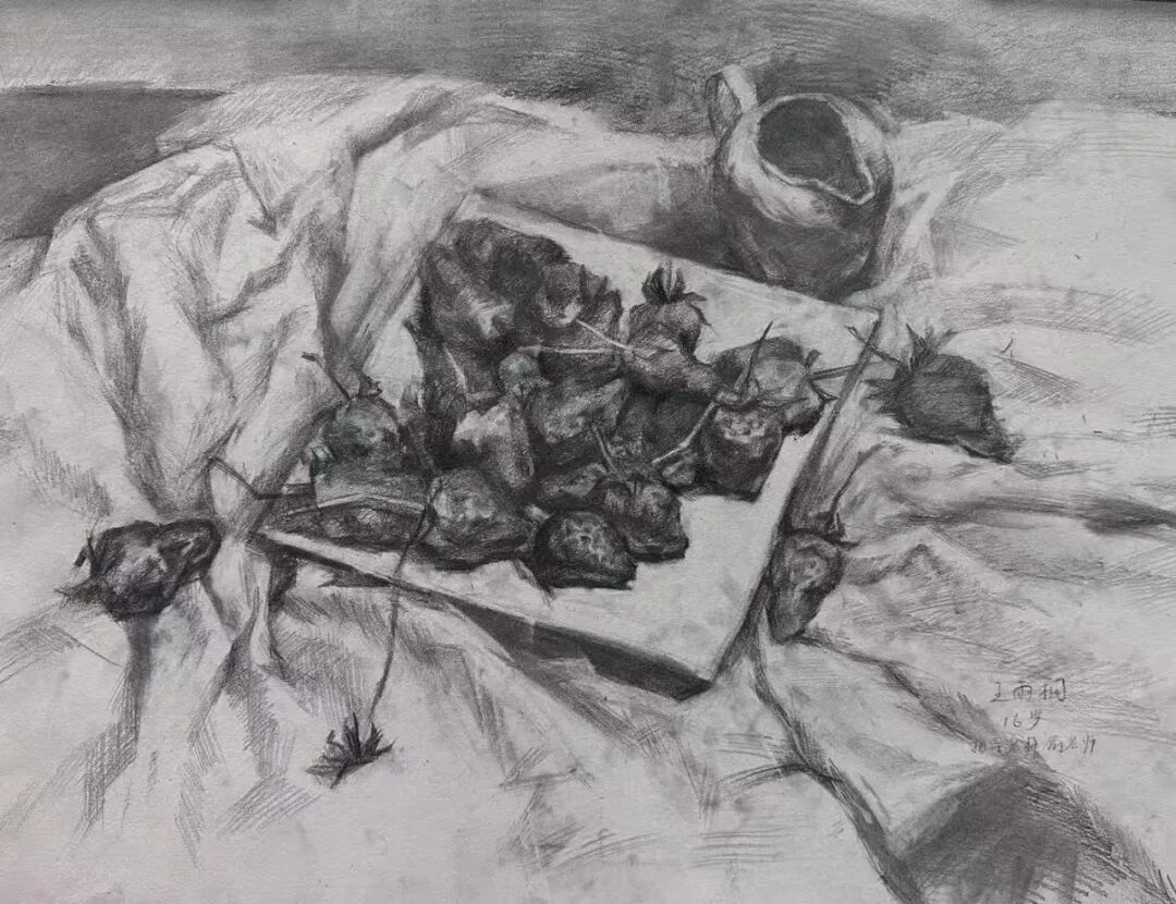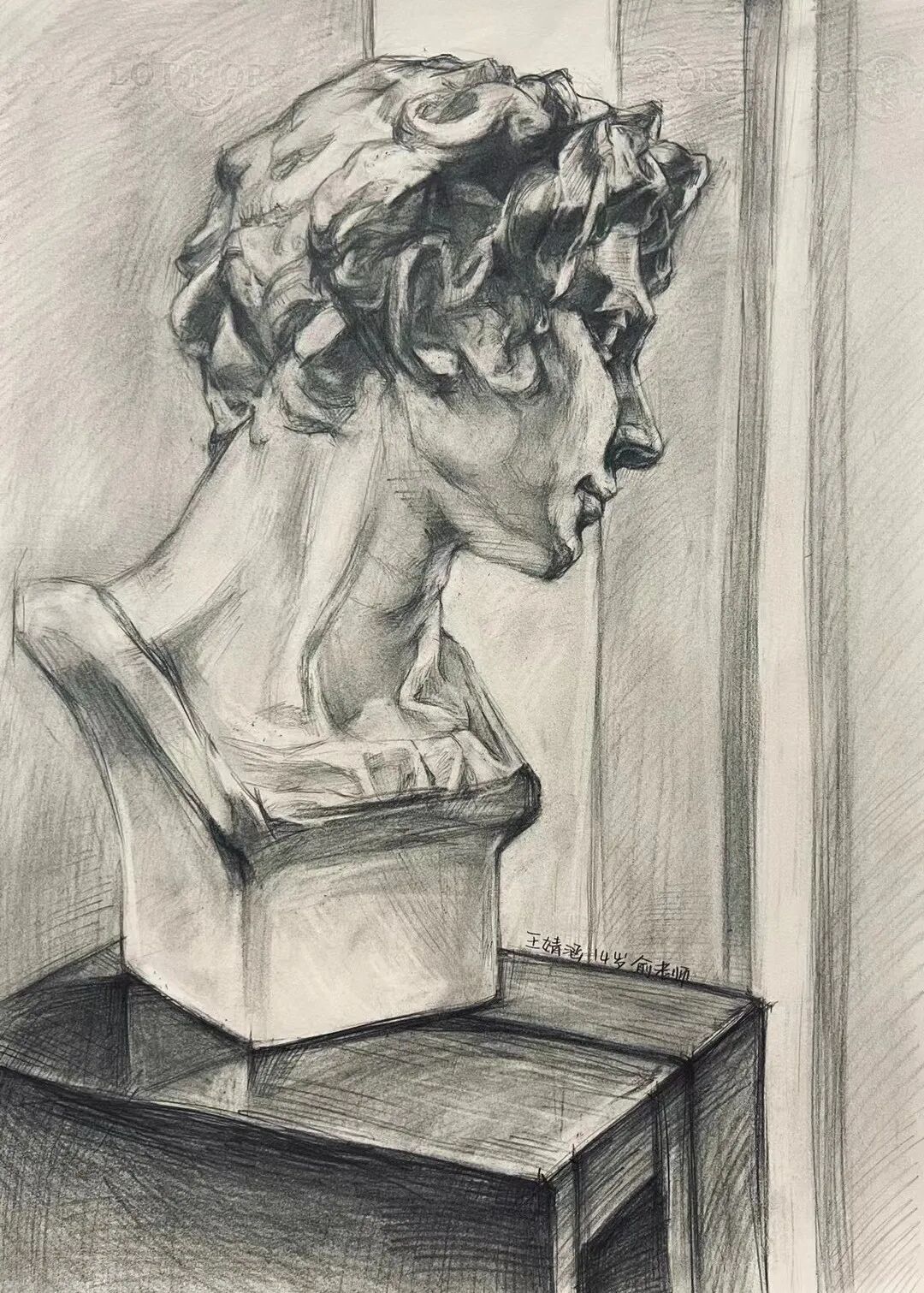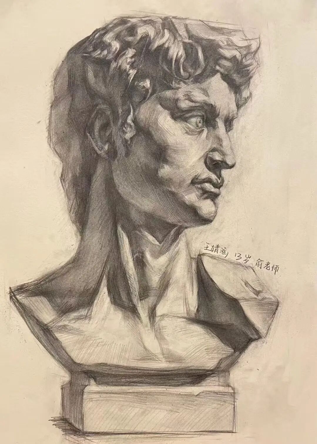 王雨桐自初一进入杭州青少年发展中心精英班后,俞老师见证了她一步步地成长,每一张作品都具有独特的素描语言,在扎实的造型基础背后,是日复一日,周复一周的训练。每周日三个小时的素描课程,既是专业的提升,也是课余最适宜的“放松”方式。