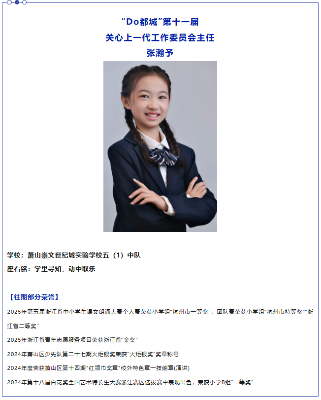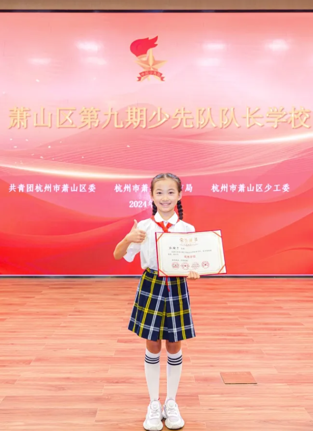 她连续三年获评“校三好学生”,更是萧山区“成绩突出少先队员”“优秀学生”。在少先队工作中,她表现亮眼,获“火炬银奖”“红领巾奖章”二星章及校外技能章,在队长学校学习中获评“优秀学员”,以责任与担当成为同学的榜样。