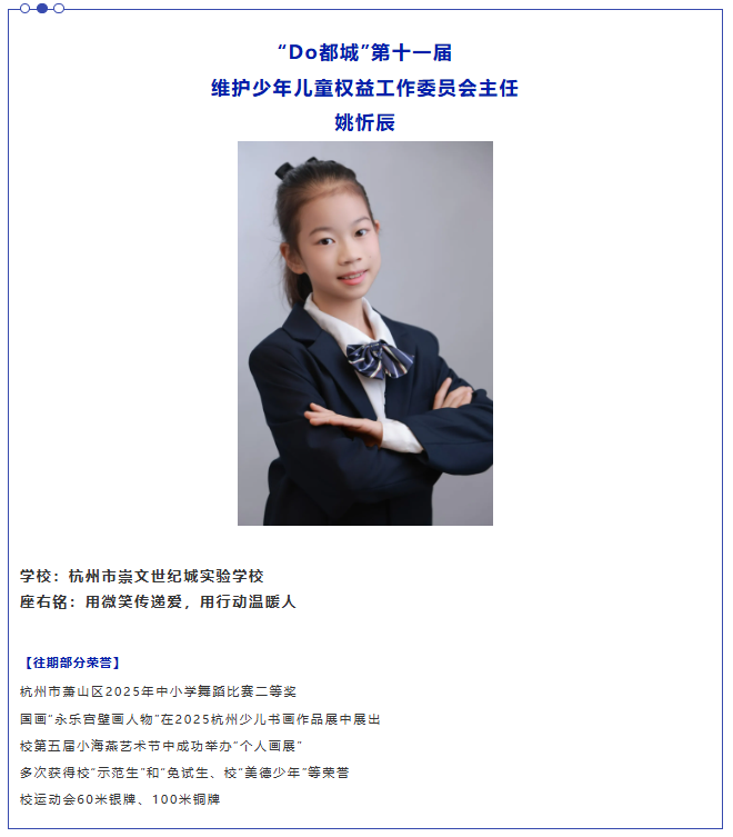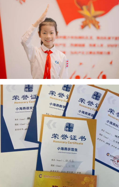 姚忻辰是一名活泼开朗、稳重大方、多才多艺的阳光女孩。她勤奋好学,成绩优异,连续多年荣获“示范生”、“免试生”荣誉。她热爱运动,在校运动会上顽强拼搏,屡次在跑步项目中斩获佳绩。她积极参与各类活动,跳蚤市场、废纸换图书、舞蹈演出、大队部工作……
