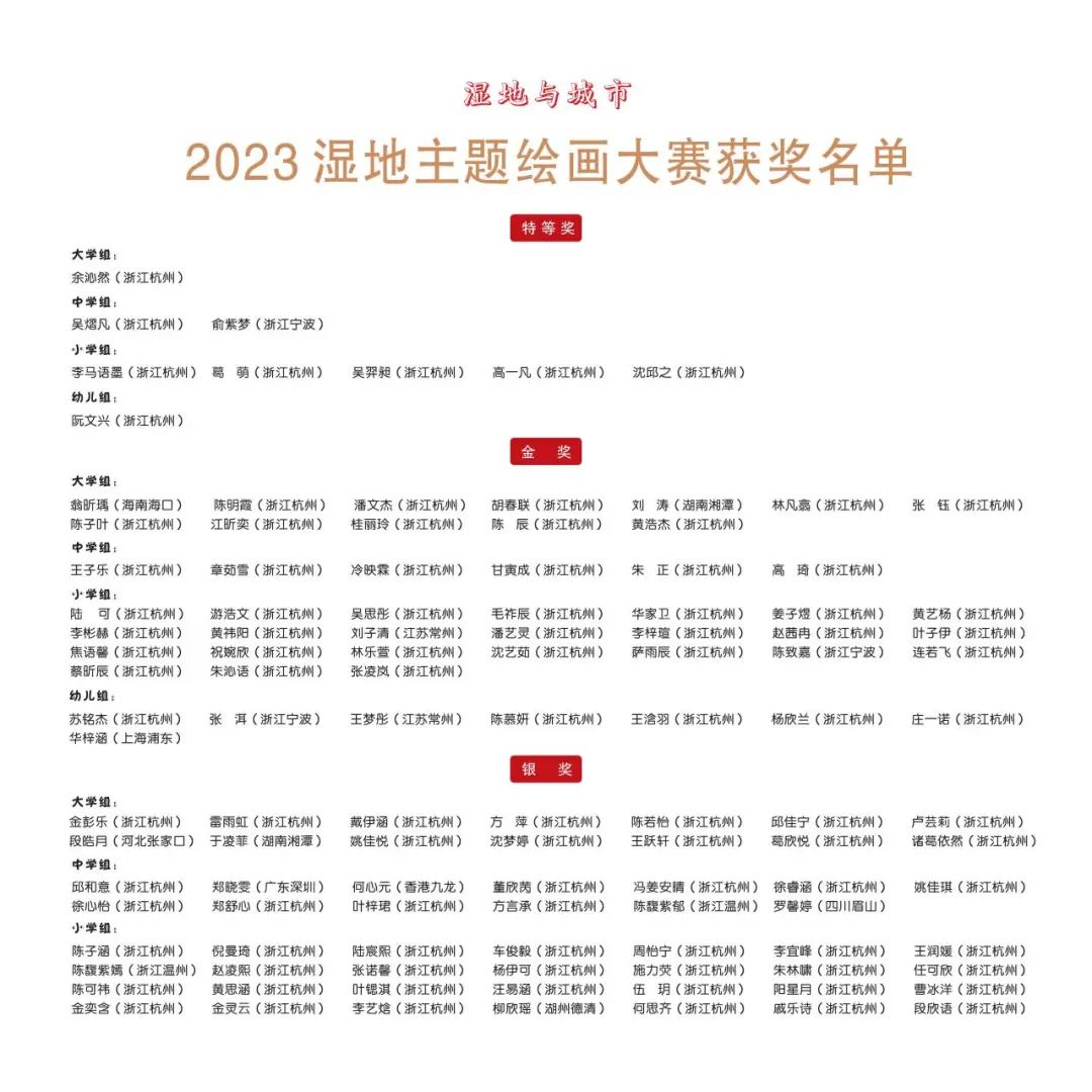 2023湿地主题绘画大赛自2月2日世界湿地日正式启动征集以来,截至7月30日,大赛共征集到有效参赛作品6329件。经专家评委的评选,共选出特等奖作品9幅、金奖作品50幅、银奖作品100幅、铜奖作品200幅、优秀奖作品419幅,优秀组织奖26个、优秀指导教师奖51名。