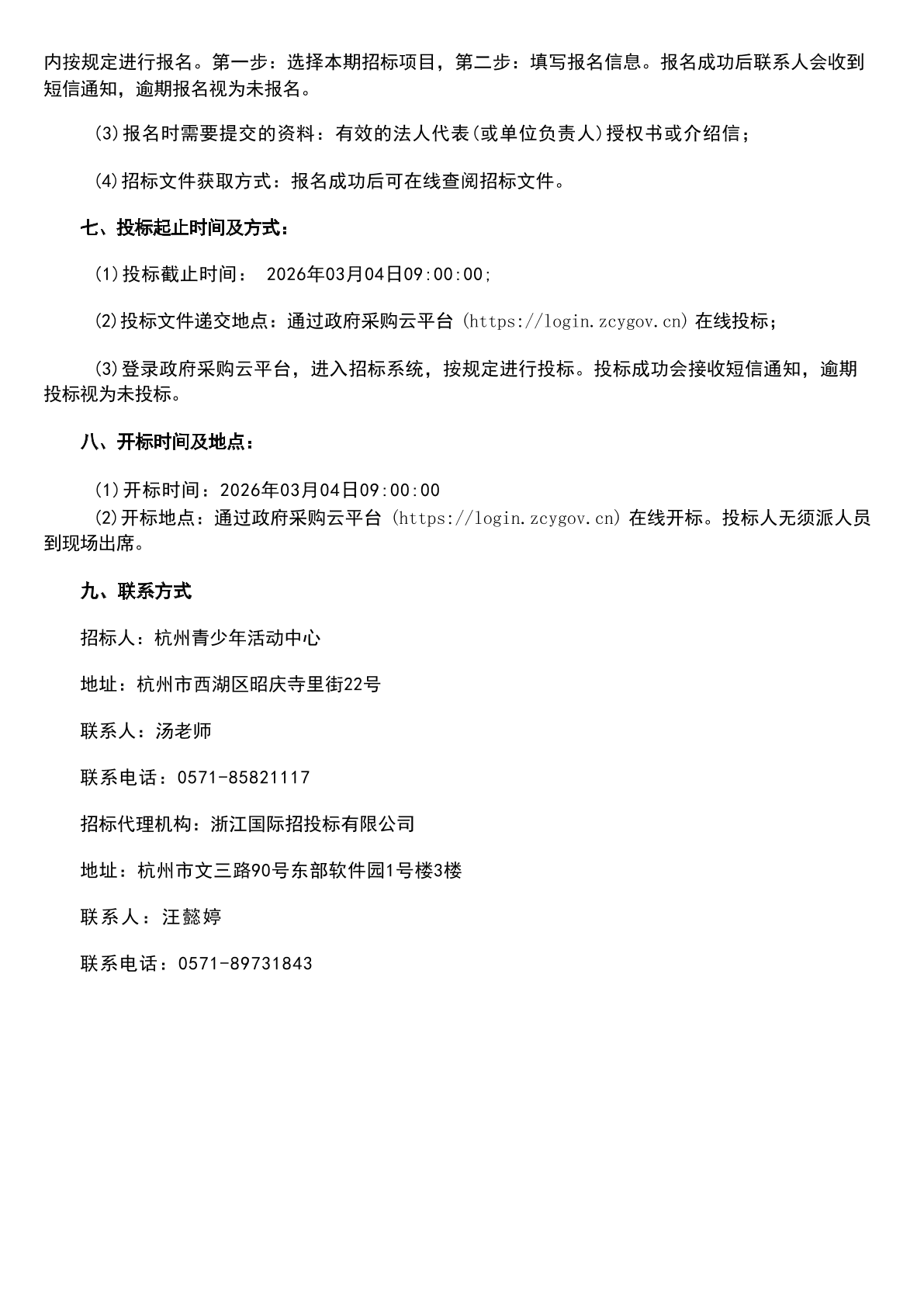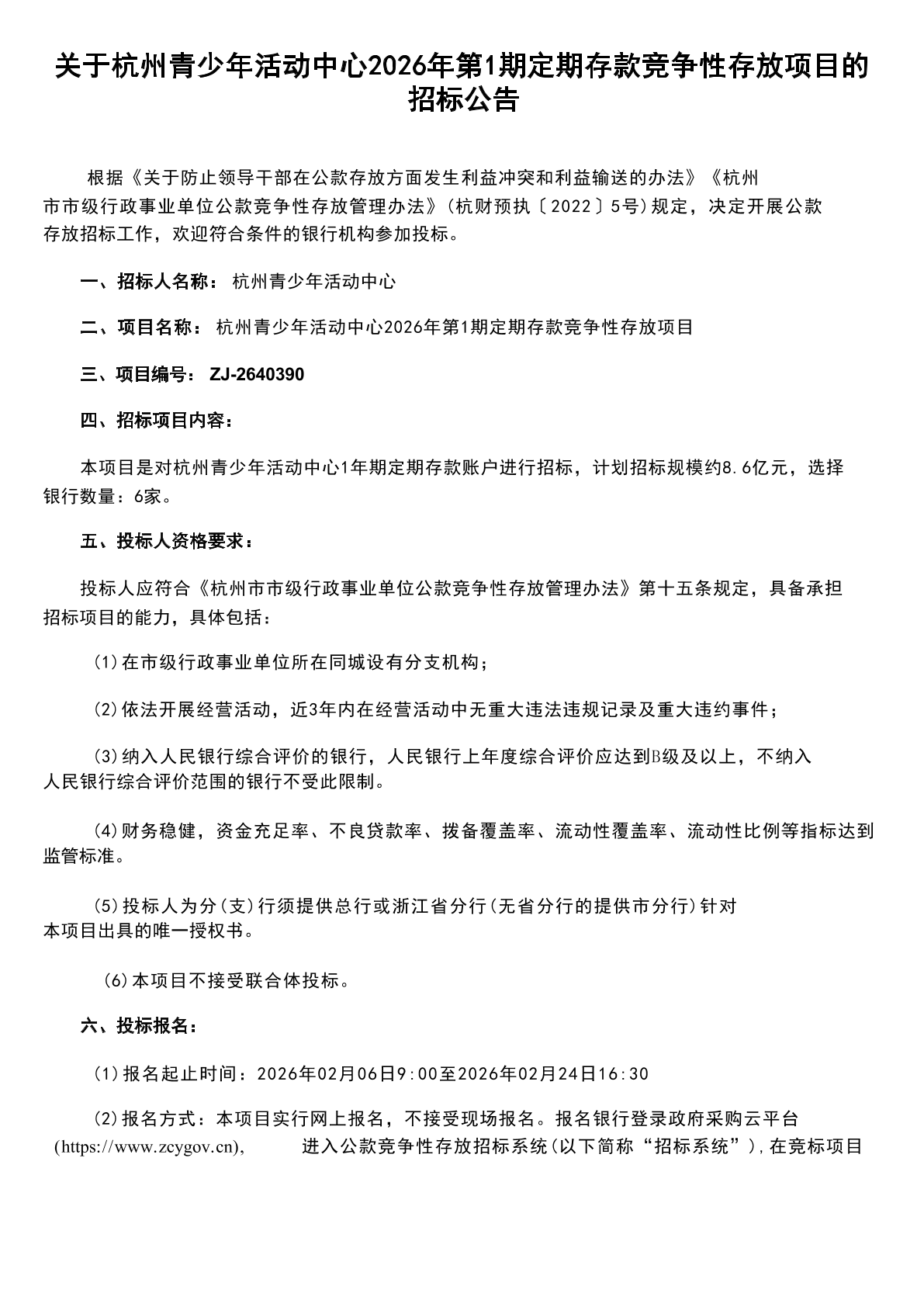 关于杭州青少年活动中心2026年第1期定期存款竞争性存放项目的招标公告