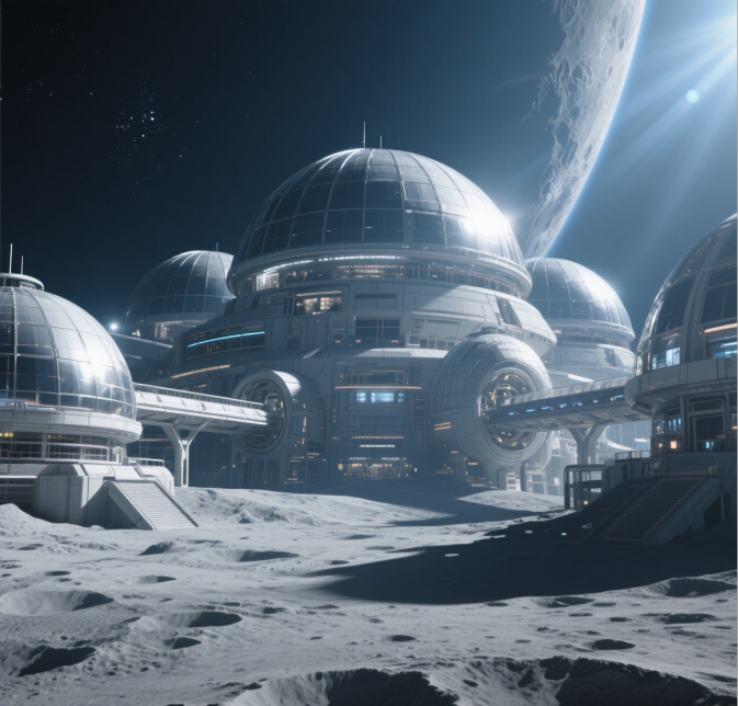 让我来为你一一解答吧。我们在月球的南极建立了庞大的月球基地,这里的光照比较均匀,适合我们生活;我们利用月球的土壤搭建了圆顶建筑,然后种植蔬菜,建立水循环装置;基地配套重力设施,我们就不用再穿上笨重的宇航服,可以悠闲地在月球漫步。