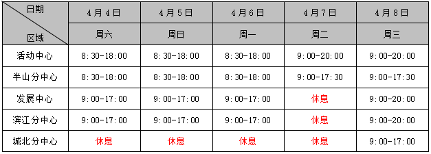 根据中心教育教学工作安排,2026年4月4日至8日,中心各区域收费窗口开放时间安排如下: