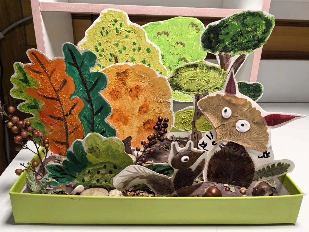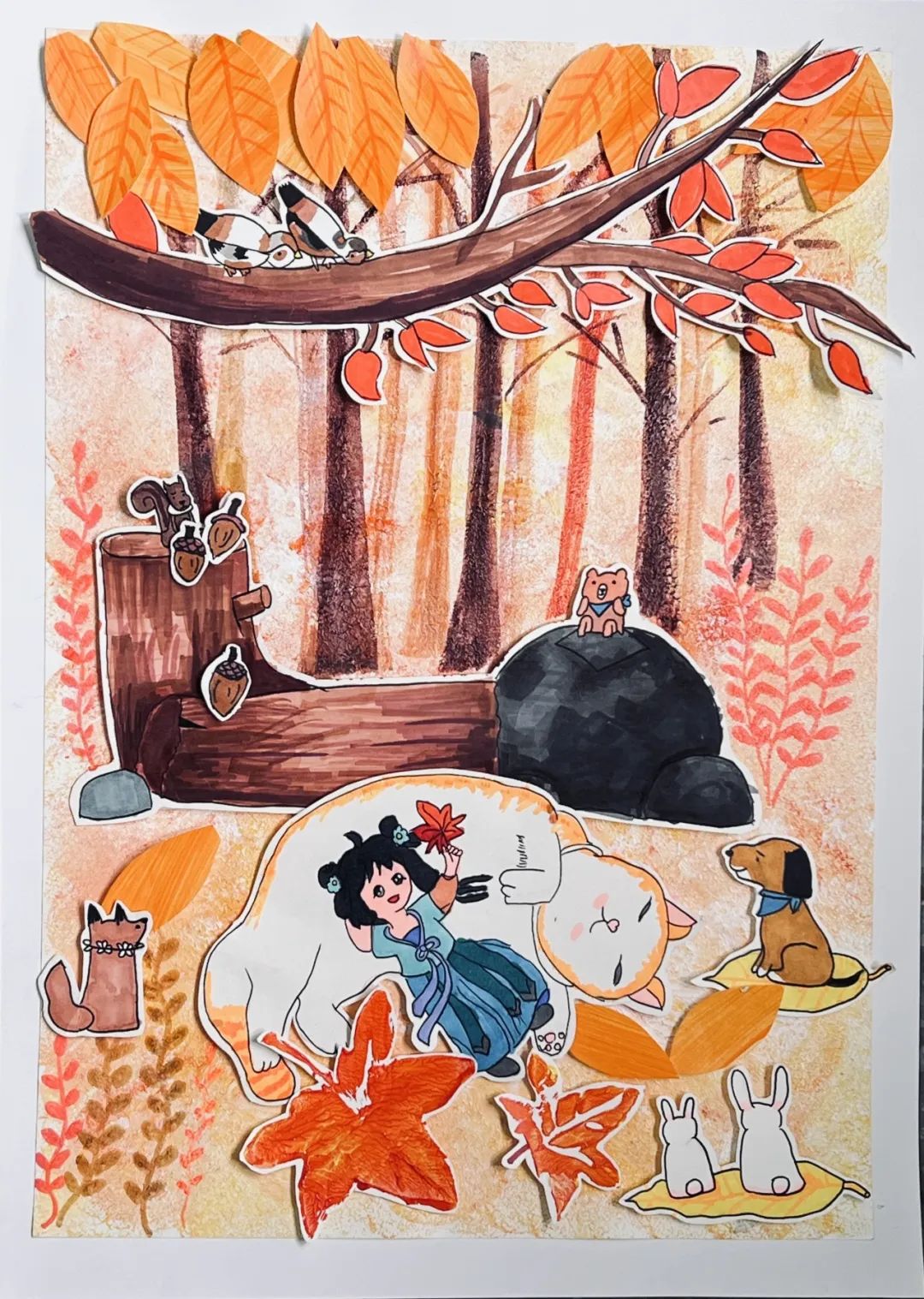 夏姐姐走了,知了的叫声唤来了秋姑娘,森林瞬间焕然一新,树木脱去了绿色的衣裳,换上五彩斑斓的妙裙。