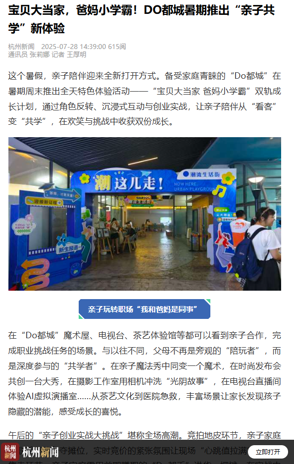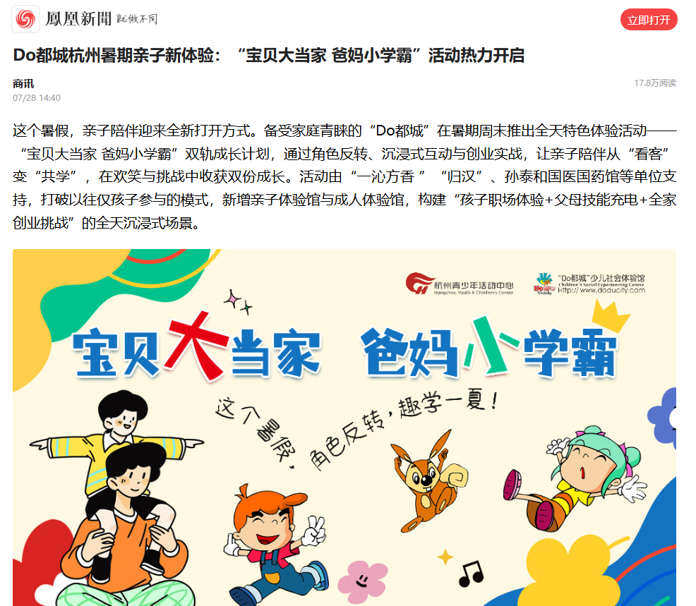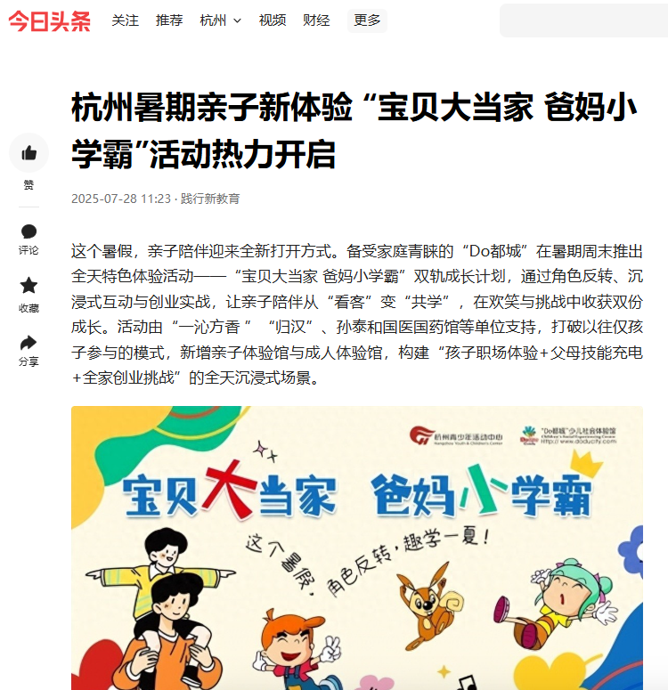 今日头条、凤凰网、杭州新闻等报道Do都城“宝贝大当家 爸妈小学霸”活动