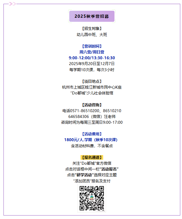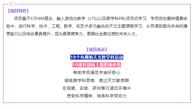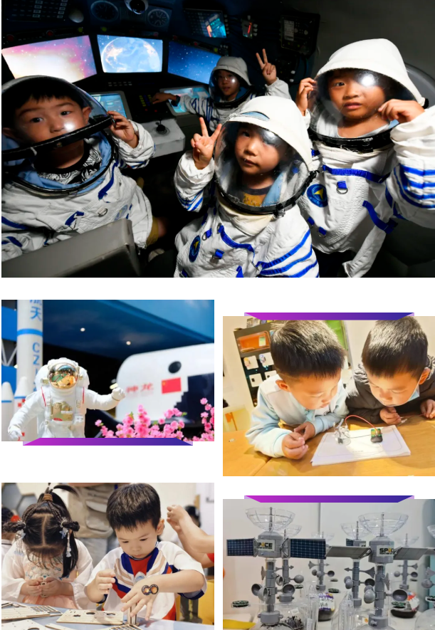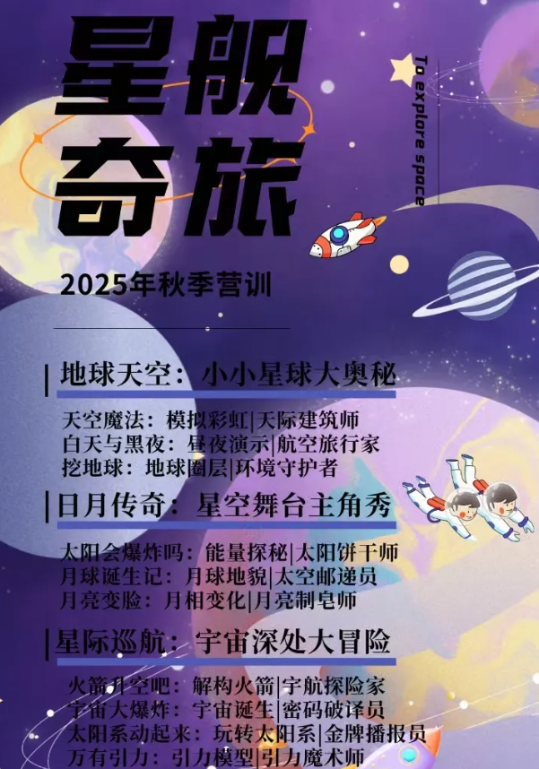 浩瀚宇宙,繁星似海,无尽的神秘呼唤智慧、勇敢的心灵开启探索。这个秋季,拿上星际登机牌,在 “Do 都城”化身勇敢的星际探险家,开启一场前所未有的太空之旅吧!营员将化身小探险家,通过10场跨学科主题天文项目以及10场定制主题天文职场活动,在沉浸式太空场景里动手做趣味科学小实验、画宇宙创意画,在星海间玩耍探秘。科技AI互动带领营员认识太阳、地球,了解宇航员的太空生活,在玩中激发好奇心,锻炼动手力、逻辑思维力、想象力和合作力,爱上探索世界。