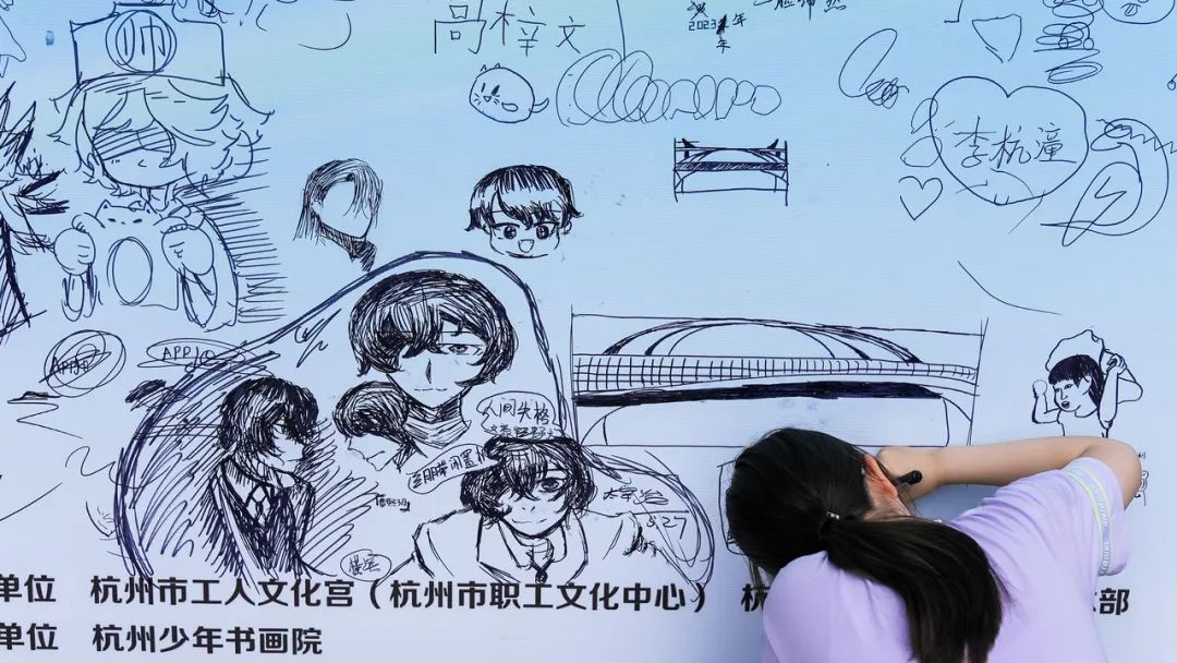5月27日下午,在杭州市工人文化宫(杭州市职工文化中心)举办了“西子小荷”杭州少年书画院成立二十周年社员作品展开幕式。开幕式现场,小社员们拿起手中的记号笔在签名墙上设计了个性签名;在六一长卷上绘制和书写了对亚运会的祝福。杭州少年书画院的社员们为自己的书画作品展开幕式做了充足的准备。