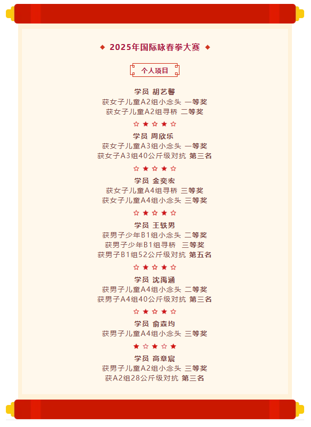 在这万众瞩目的国际比赛中,“Do都城”少儿咏春项目代表队获佳绩。咏春拳套路类比赛获得2金牌、3银牌、5铜牌,对抗类比赛获得3个第三名,1个第五名。
