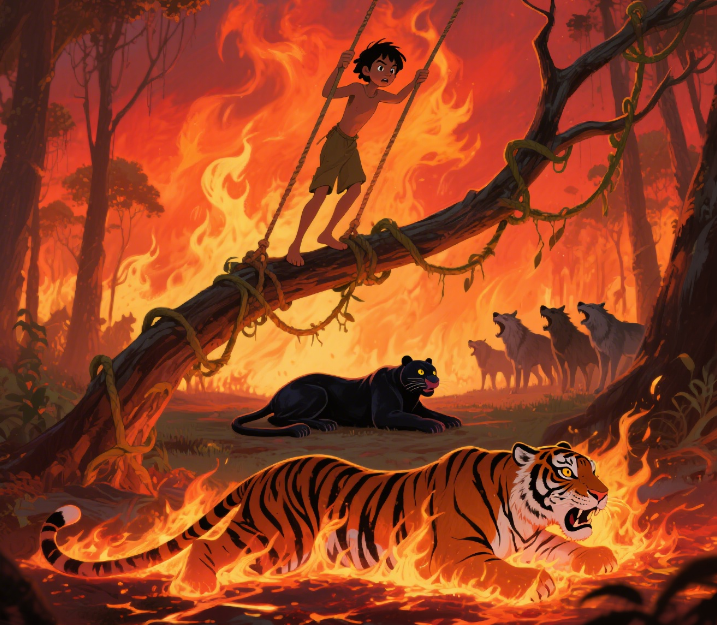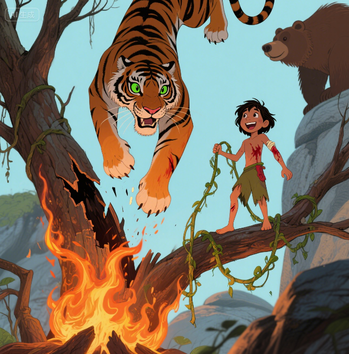 “我才不怕你!”毛克利大喊一声,猛地向上一跳,抓住藤蔓荡了出去。谢利·可汗气得扑过来——“咔嚓!”树枝断了!它想抓旁边的树枝,可身子太重,“嗷”地一声掉进了火海。
