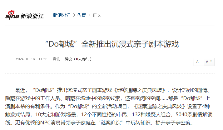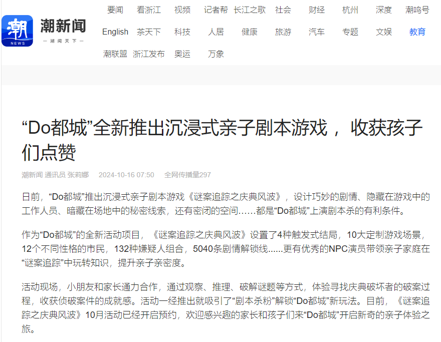 潮新闻、新浪浙江报道“Do都城”沉浸式亲子剧本游戏