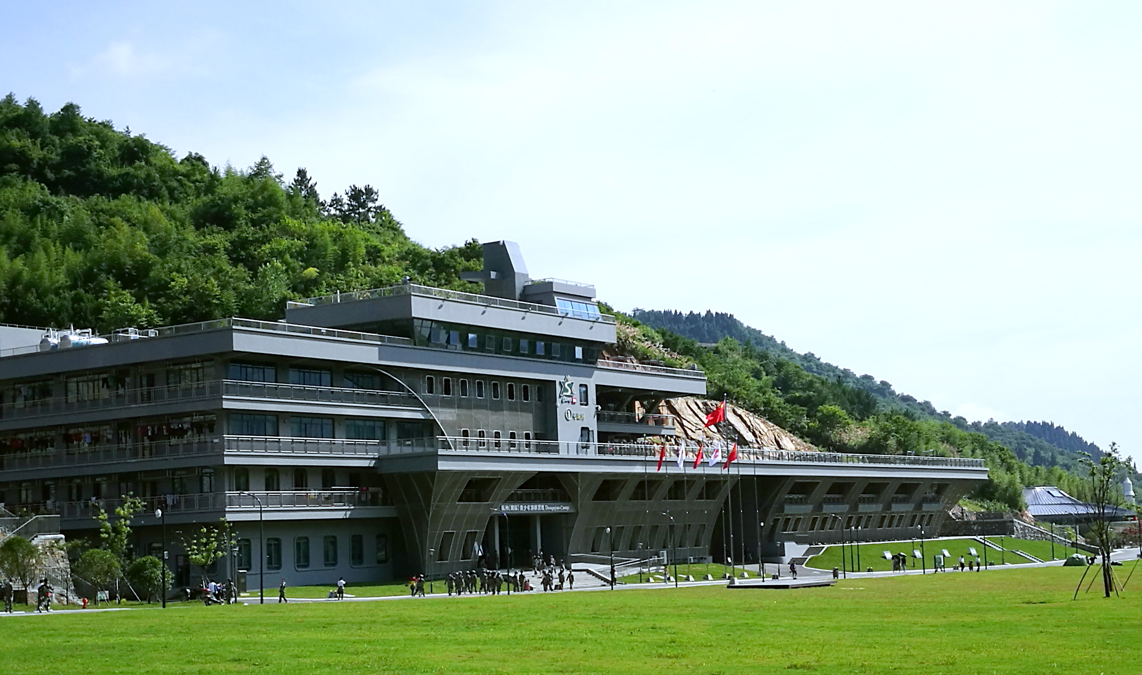 航母楼位于营地的中心区域,外形为一艘航空母舰,寓意面向未来的海洋时代。1层包含指挥中心、供应处、自主烹饪体验室、家庭实用电(水、木)工等综合体验室以及急救技能训练室等场所,其中,供应处提供自助购物和物品租赁等服务;2、3、4层为可容纳500余人的集体营房,在3层和4层之间巧妙地设置了可供营员体验的火灾模拟逃生装置。5层是营地集中办公区,也有供营员集体活动的多功能室,以及利用营房与山体建设的含激光模拟射击房。少年营房集吃、住、学、玩等为一体,为洞桥营地的核心建筑。