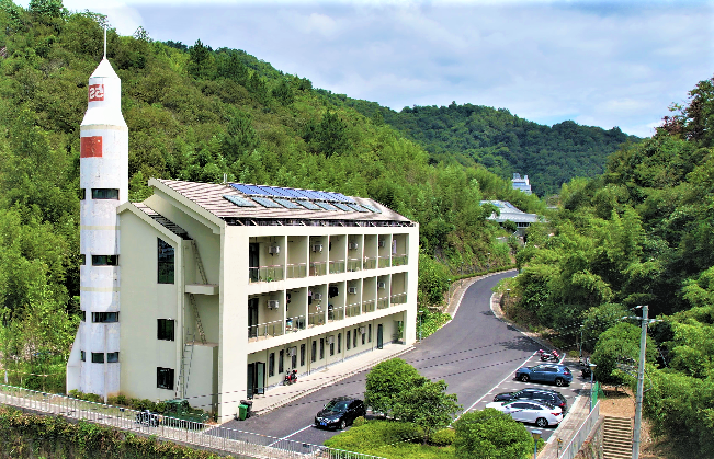 火箭楼位于营地的东侧,楼的一侧有火箭造型装饰,寓意为面向未来的太空时代。建筑面积470平方米,共分三层。1层为教职工食堂,2、3层为教官及志愿者的宿舍,为洞桥营地的主要建筑之一。