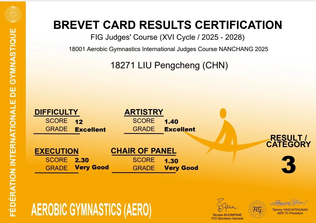 杭州青少年活动中心体育部高级教师刘鹏程,在刚刚结束的由国际体操联合会举办的“2025-2028周期竞技健美操国际级裁判员”培训班中,以优异的成绩通过考试,获得健美操国际三级裁判员。这是中心的首位国际级裁判,特此祝贺!