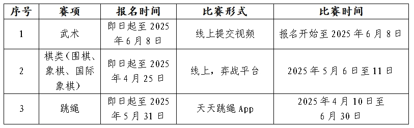 棋类项目(围棋、象棋、国际象棋)和跳绳项目线上参赛手册另行发布,详见“全国青少年传统体育项目比赛”微信公众号和赛事网站“赛事公告”栏目(网址https://www.qsnedu.com/eduplatform/html/gxjs/#/head/notice)。