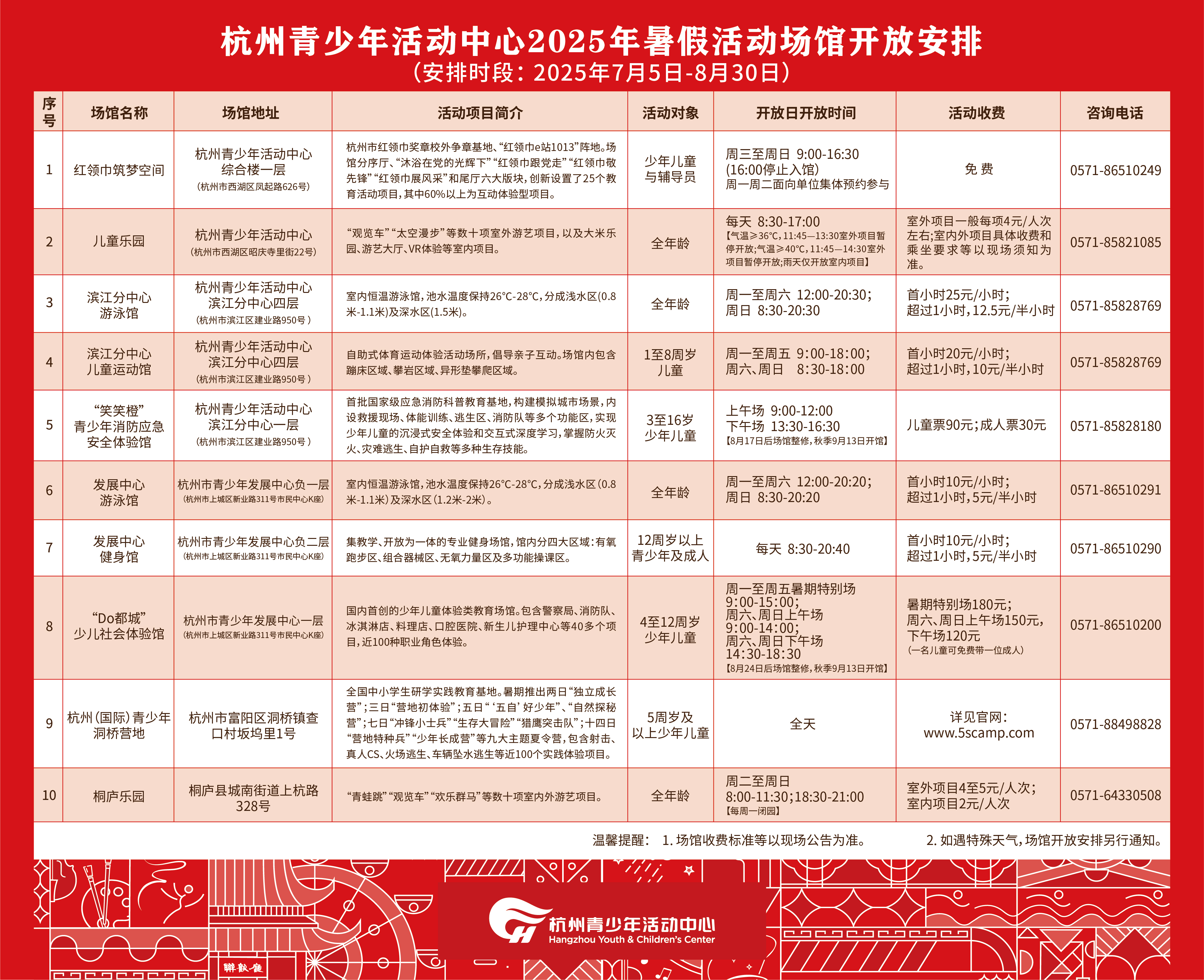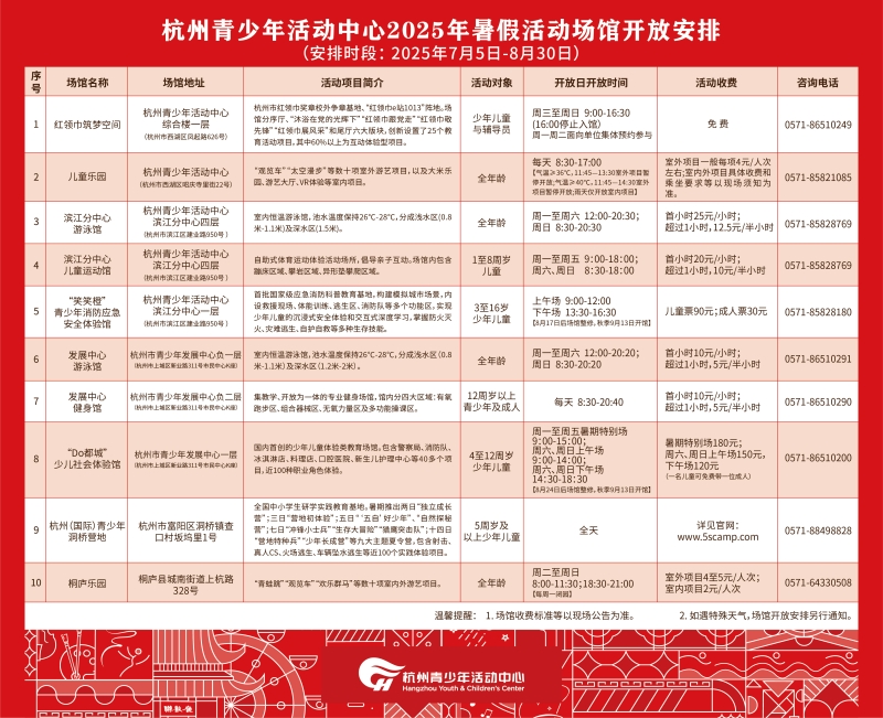 这个暑期,活动中心的红领巾筑梦空间、儿童乐园,滨江分中心的游泳馆、儿童运动馆、“笑笑橙”青少年消防应急安全体验馆,发展中心的游泳馆、健身馆、“Do都城”少儿社会体验,还有杭州(国际)青少年洞桥营地和桐庐乐园等十大阵地定时开放,为大家提供涵盖实践体验、运动健身、安全教育等多元场景,助力假期成长与探索,详见《杭州青少年活动中心2025年暑假活动场馆开放安排》。