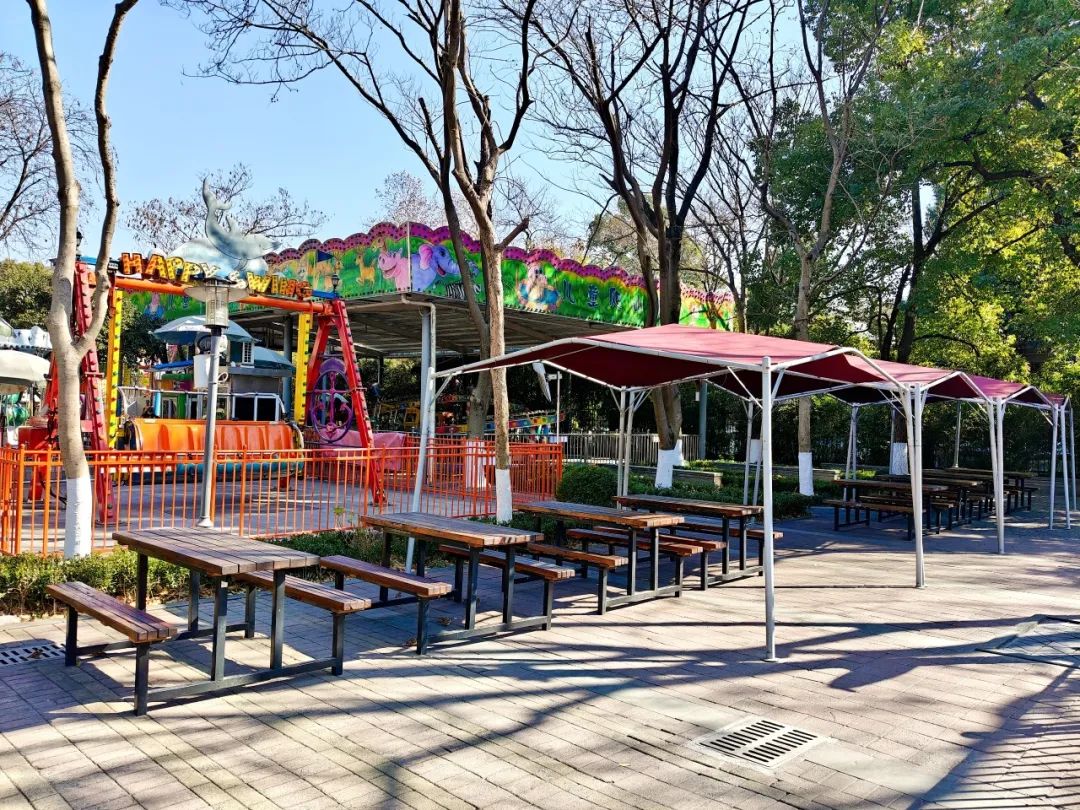 当您选择外卖时,请您在室外享用,例如服务中心前的长凳大桌就很合适,这里还配备了棚子以提供遮阳和挡雨功能。我们衷心感谢您的理解与配合!