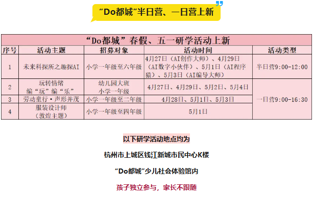 【活动时间】4月27日、4月29日、5月2日、5月4日,每期为一日营9:00-16:30