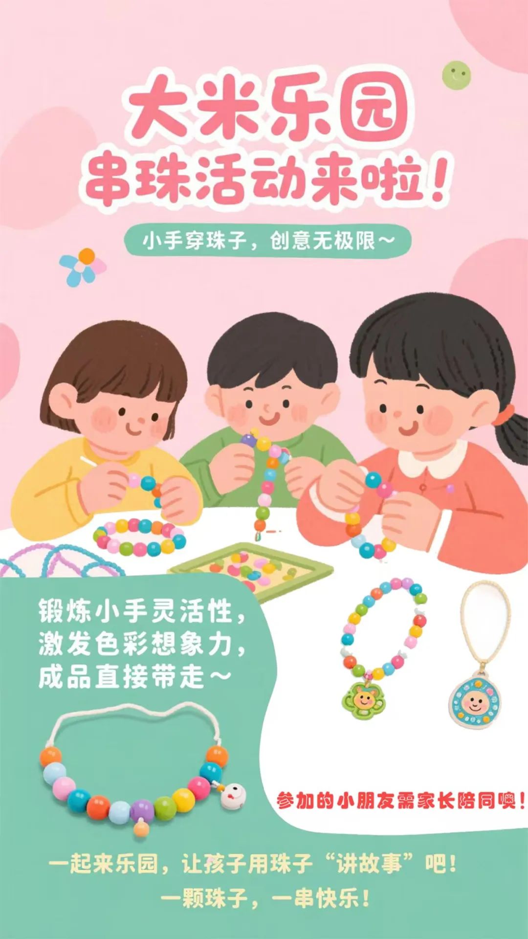 大米乐园变身 魔法珠珠工厂 ,用指尖点亮 创意星河 !小手穿珠、亲子协作、故事创作…… 快带上宝贝来挑战 串珠大师 称号吧!