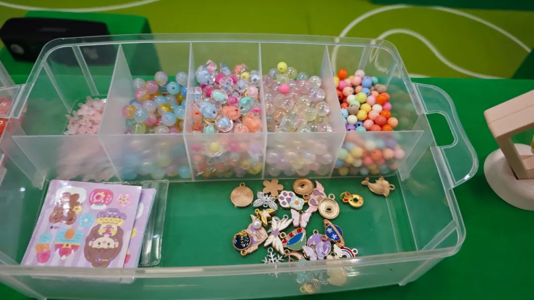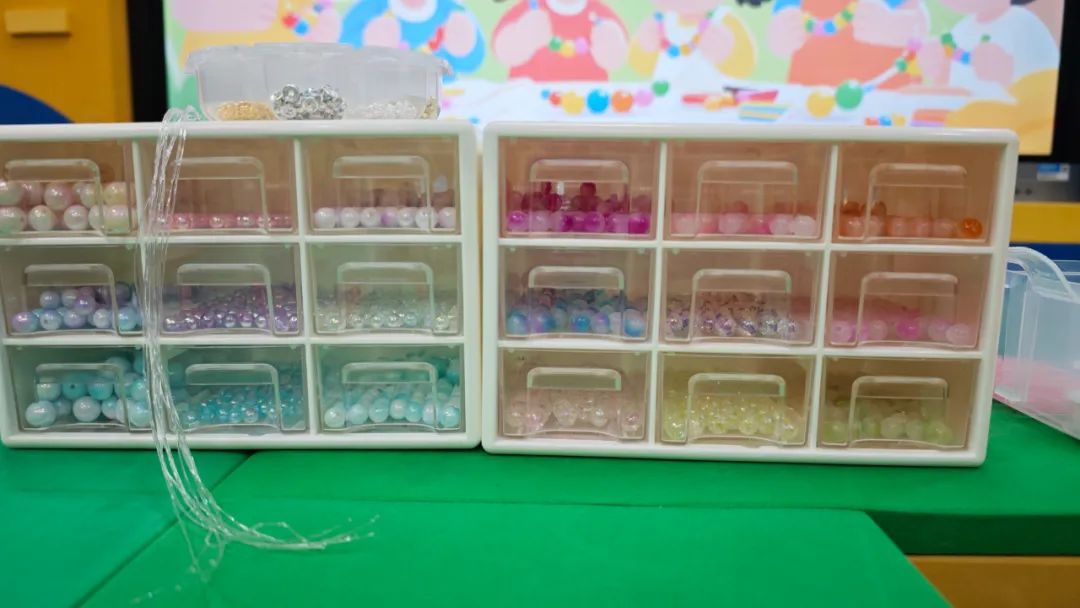 马卡龙色系、星空渐变珠、blingbling宝石配件……装在透明格子里,按色系和主题分类。孩子们自由搭配专属色卡!是梦幻童话风,还是炫酷太空系? 每一串都是独一无二的艺术品