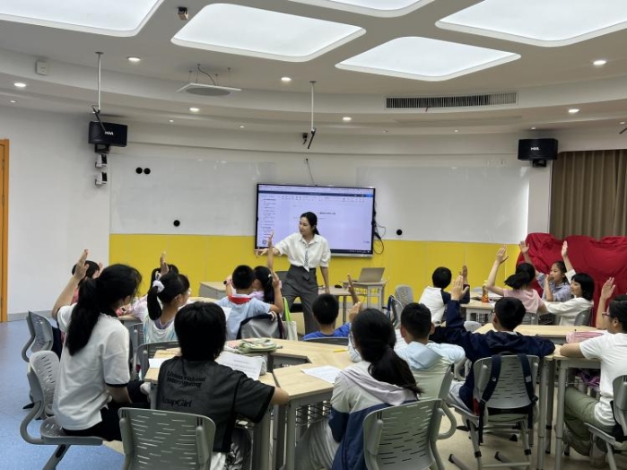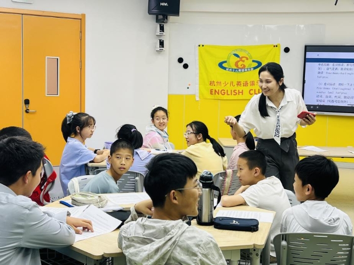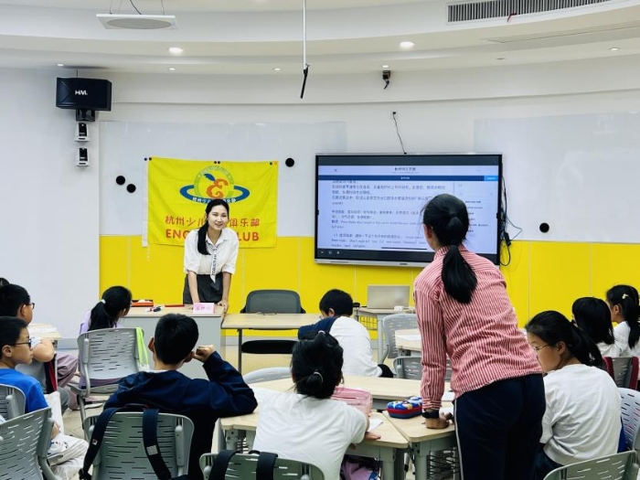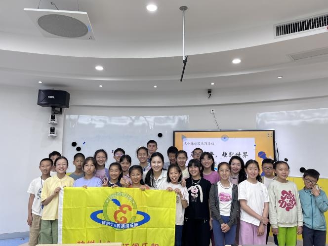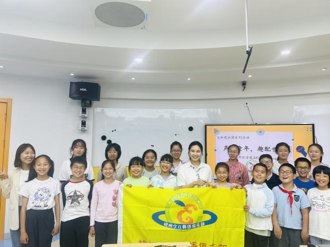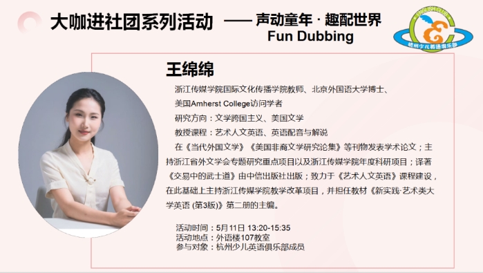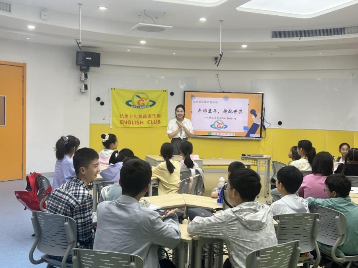 5月11日下午,杭州青少年活动中心外语部107教室内童声朗朗,“大咖进社团”系列活动之“声动童年·趣配世界”——玩转配音魔法Fun Dubbing在此顺利举办。浙江传媒学院国际文化传播学院王绵绵老师以声音艺术为媒,以“配音魔法”为主线,为杭州少儿英语俱乐部的社员们带来了一堂沉浸式语言艺术实践课。