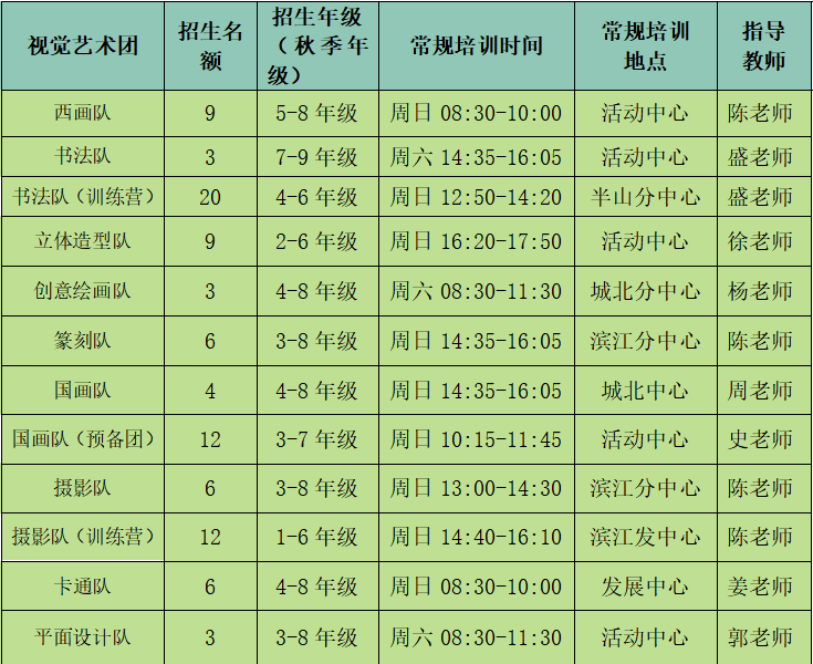 杭州少儿艺术团视觉艺术分团下设创意绘画队、国画队、卡通队、西画队、平面设计队、立体造型队、摄影队、书法队、篆刻队九个队。现杭州少儿艺术团视觉艺术分团将面向杭城招收具有艺术潜质、热爱艺术的中小学生。