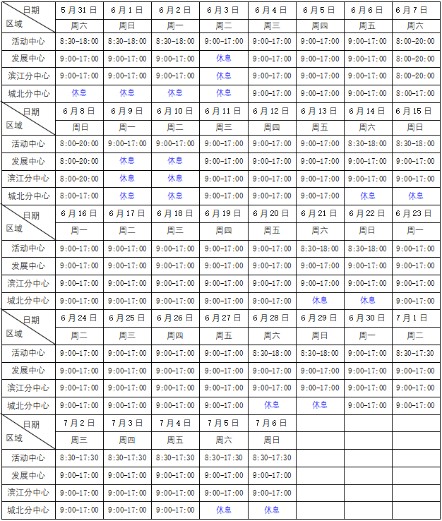 (注:发展中心、滨江分中心、城北分中心三地收费室午休时间:12:00—13:00)