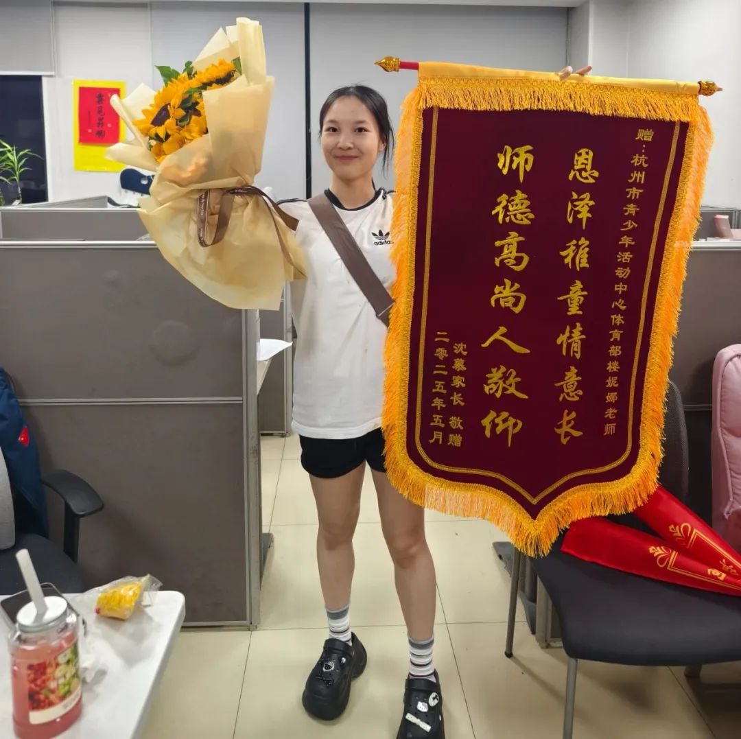 这面锦旗、这束向日葵,是家长的感恩,更是教育初心的映照—— 楼妮娜老师用爱与智慧,让每个孩子在体操垫上绽放属于自己的光彩,也让幼儿体操课程成为照亮童年的一束温暖阳光。愿每个孩子都能在这样的师爱中,像向日葵般永远追着光生长。
