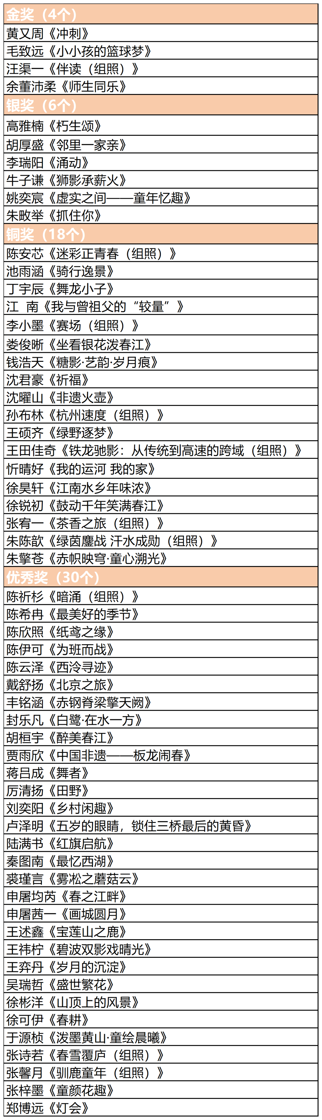 由杭州市文化广电旅游局、共青团杭州市委主办,杭州市文化馆(杭州市非物质文化遗产保护中心)承办,杭州青少年活动中心美术部、杭州市各区、县(市)文化馆协办的“岁月泼墨·童绘新章”2025杭州市少儿书画摄影大赛已圆满结束。本次大赛共收到作品近4000件,经专家评审,评选产生美术类奖项291个(其中金奖18个、银奖30个、铜奖47个、优秀奖196个),书法类奖项156个(其中金奖10个、银奖15个、铜奖32个、优秀奖99个),摄影类奖项58个(其中金奖4个、银奖6个、铜奖18个、优秀奖30个);优秀辅导奖25个,优秀组织单位15个(具体详见附件)。“岁月泼墨·童绘新章”2025杭州市少儿书画摄影大赛优秀作品展将于2025年6月21日—26日在浙江自然博物院(杭州馆)二楼油画展厅举办。