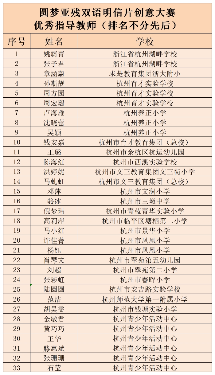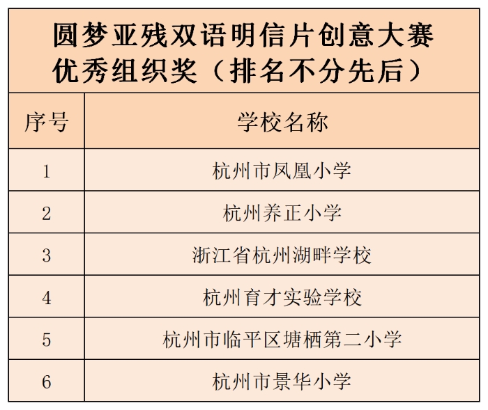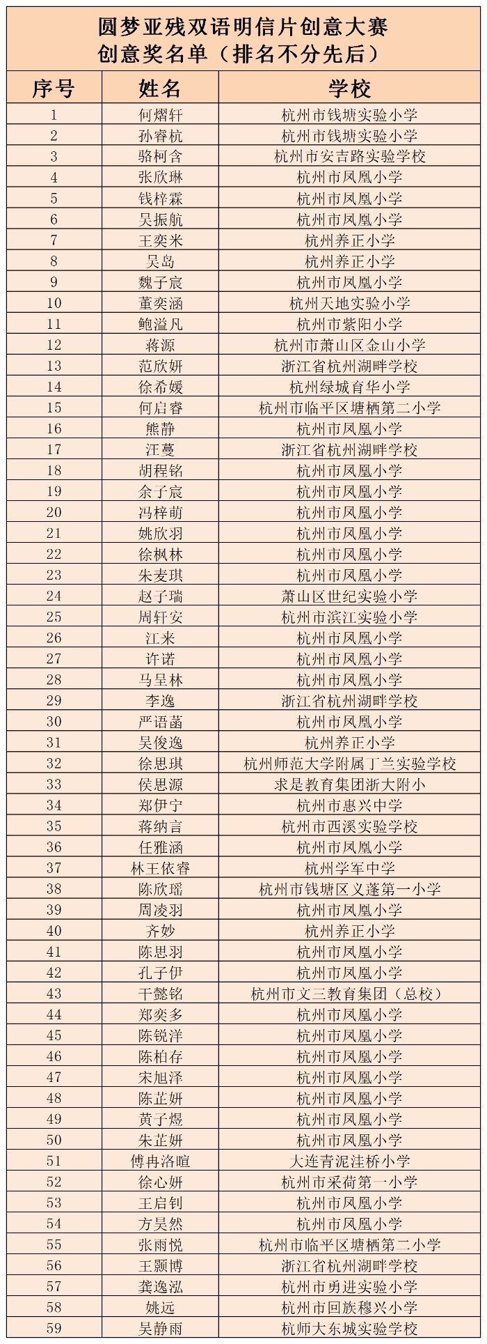 那谁设计的亚残双语明信片最有创意、有温度呢?经过专家评审和网络票选,共计17万人次投票,最终角逐出一等奖10名,二等奖20名,三等奖30名,创意奖59名。大赛组委会根据作品质量、作品数量、创意视角、双语运用等综合因素评选出6个优秀组织奖和若干优秀指导教师。快来看看最新出炉的获奖名单吧!
