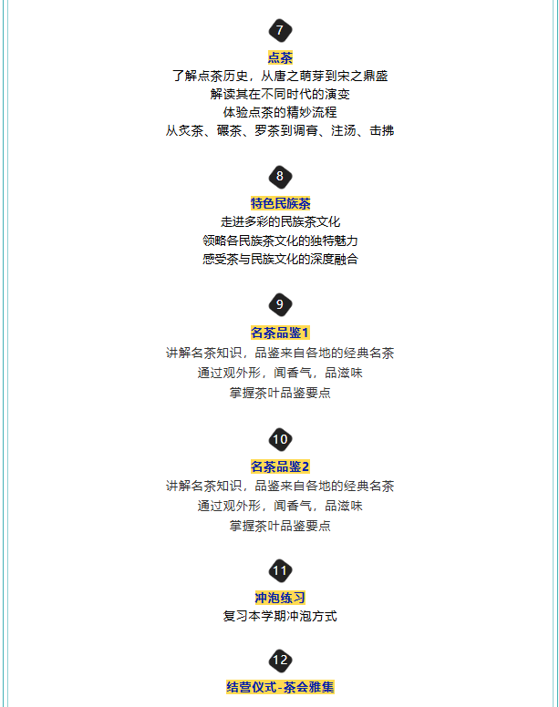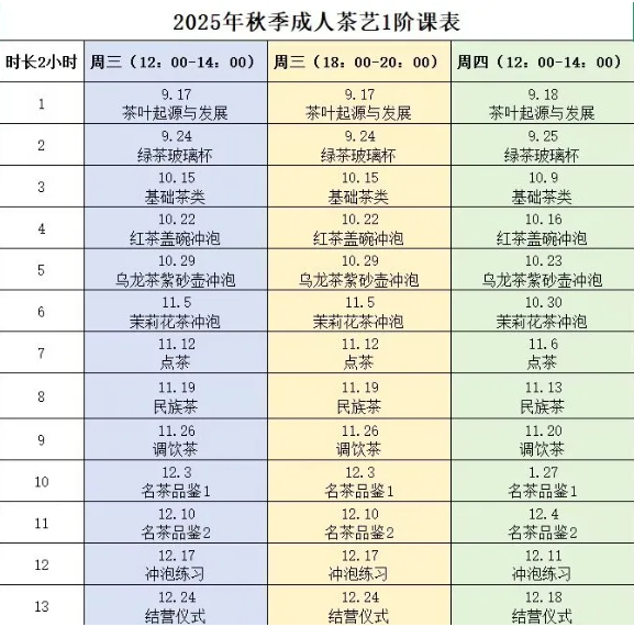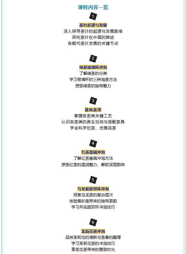 课程循环开设,设置灵活选课,学员可以选择购买六次课程,在课表中自由挑选适合自己的六次茶课进行学习。