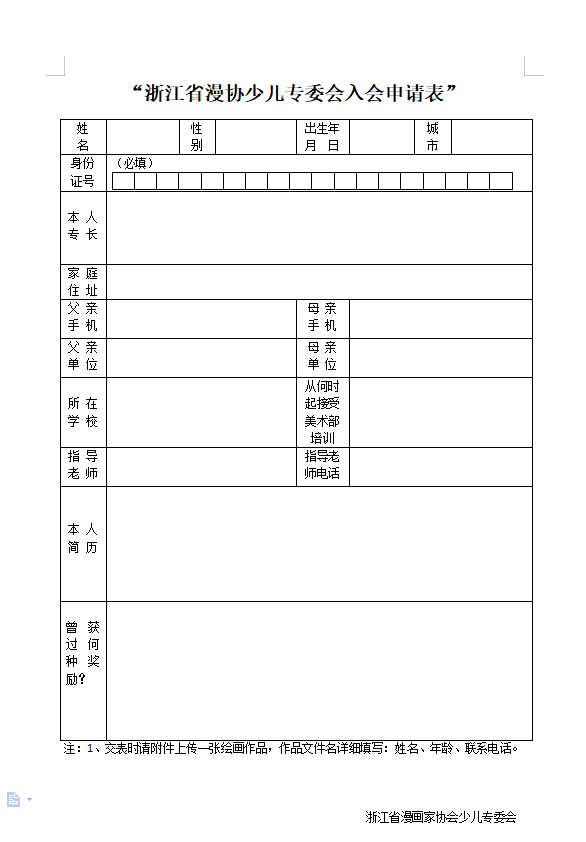 1.9月30日前,填写“浙江省漫协少儿专委会入会申请表”以及一张绘画作品发送至1175880557@qq.com邮箱,参与初选。