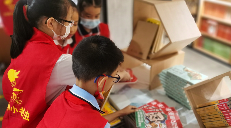 书怎样摆放才显得整齐又醒目?造型怎样设计才会引人入胜?在学习了门市图书摆放的基本规则后,队员们集思广益,小脑袋飞速运转,争先恐后地开始了自由创作。