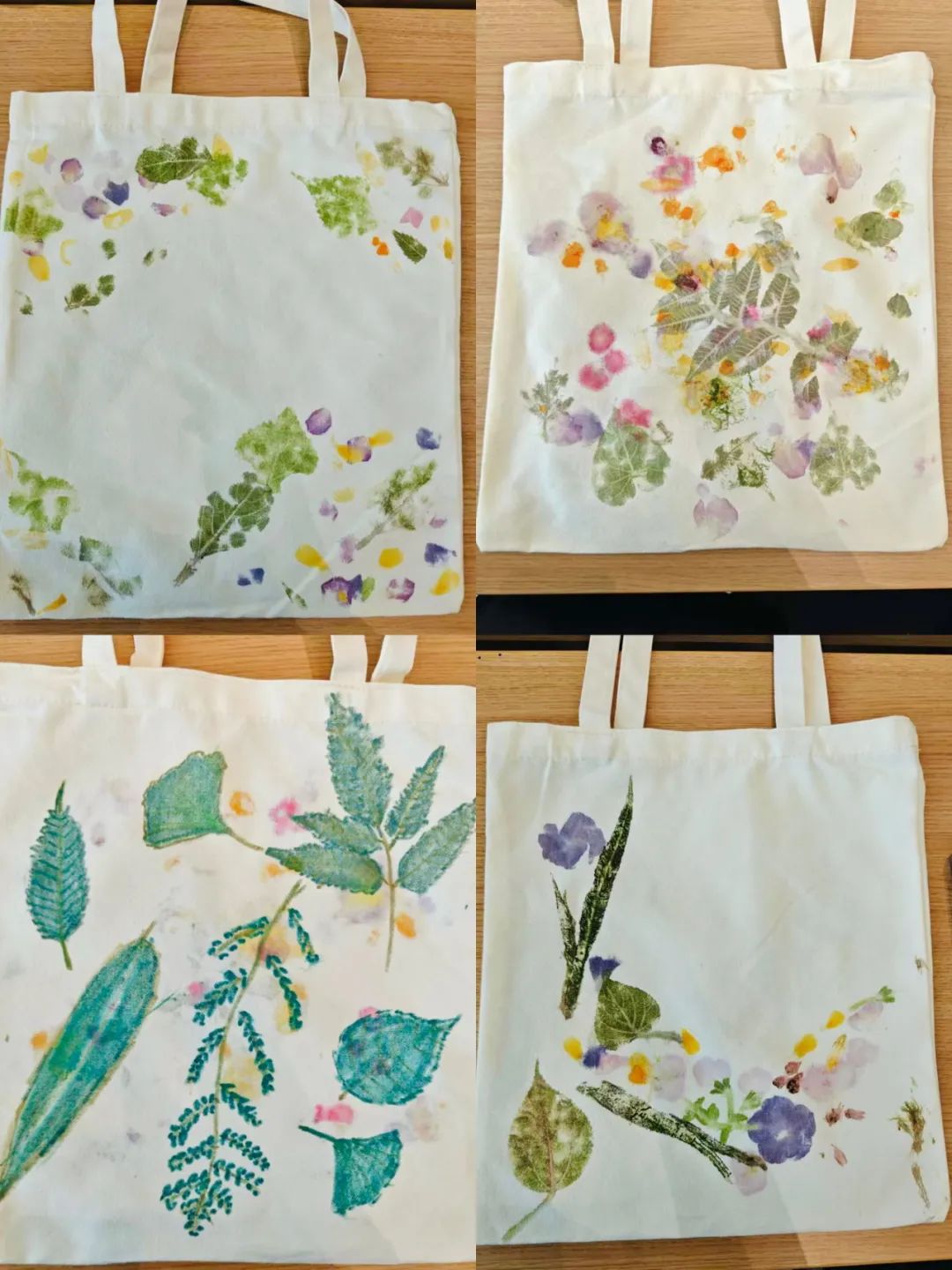 周老师带领大家学习了如何观察叶片的形状、颜色以及叶脉方向;了解了传统非遗文化——植物拓染,并用植物拓染的染色原理与技法,设计出独具创意的帆布包。