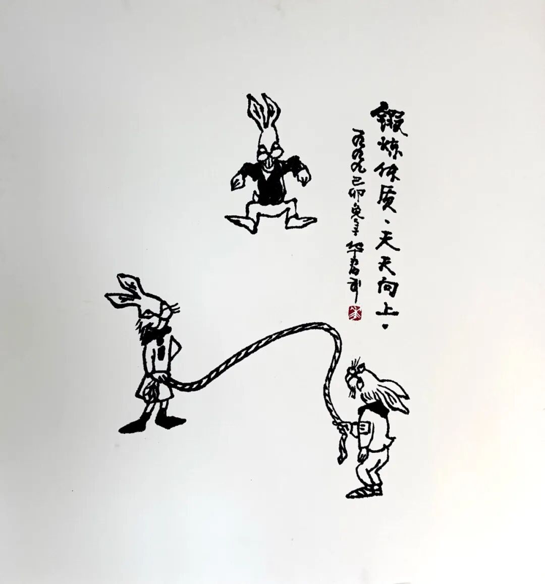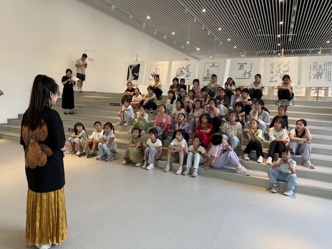 紧接着,王展老师为孩子们带来了一场关于华君武先生“笔底兔影 纸上华章”展的深度解读。今年是华君武先生诞辰110周年,他生肖属兔,一生创作了无数以兔为题材的妙趣漫画。王展老师生动地讲述着每一幅作品背后的故事,那些兔子不再是简单的绘画形象,而是被赋予了时代的情感与生活的烟火气。孩子们聚精会神地聆听,在华老的漫画世界里感受着幽默与智慧的魅力。