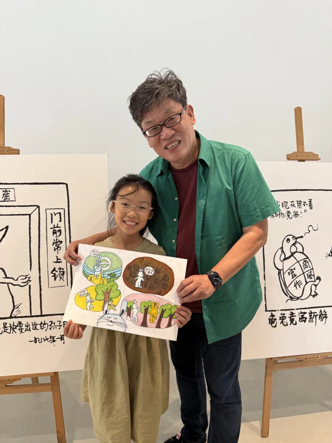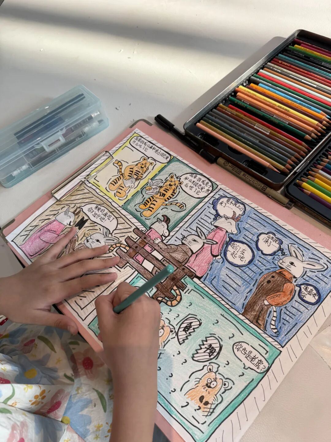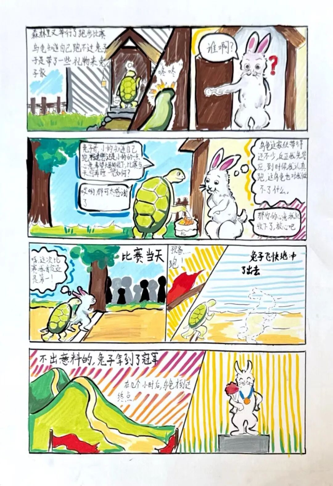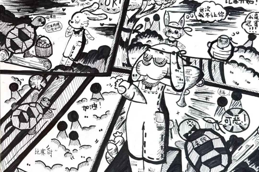 有的小画家抓耳挠腮,灵感忽隐忽现;有的则成竹在胸,下笔如有神。一个个奇思妙想的故事在画纸上诞生:有新编龟兔赛跑,有时尚的都市兔子,有穿越到古代的兔子......他们将上午的所见所闻、所感所想,都融入到了这小小的四格漫画中,用自己独特的视角和绘画风格,诠释对华老作品的理解和对漫画的热爱。