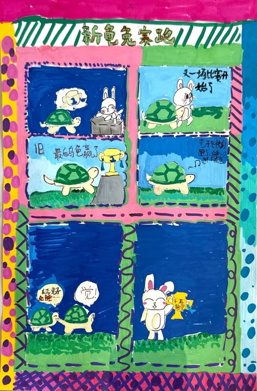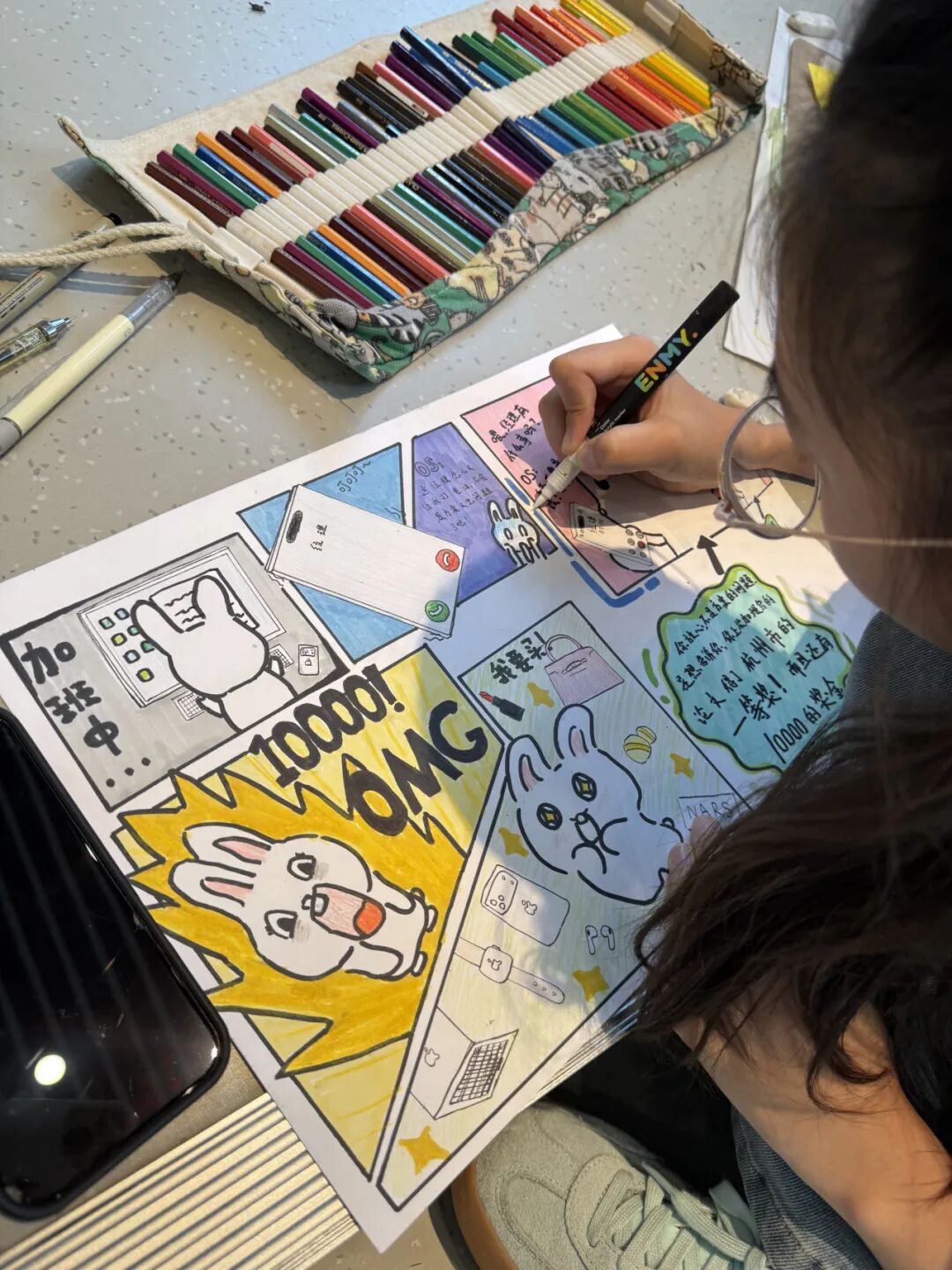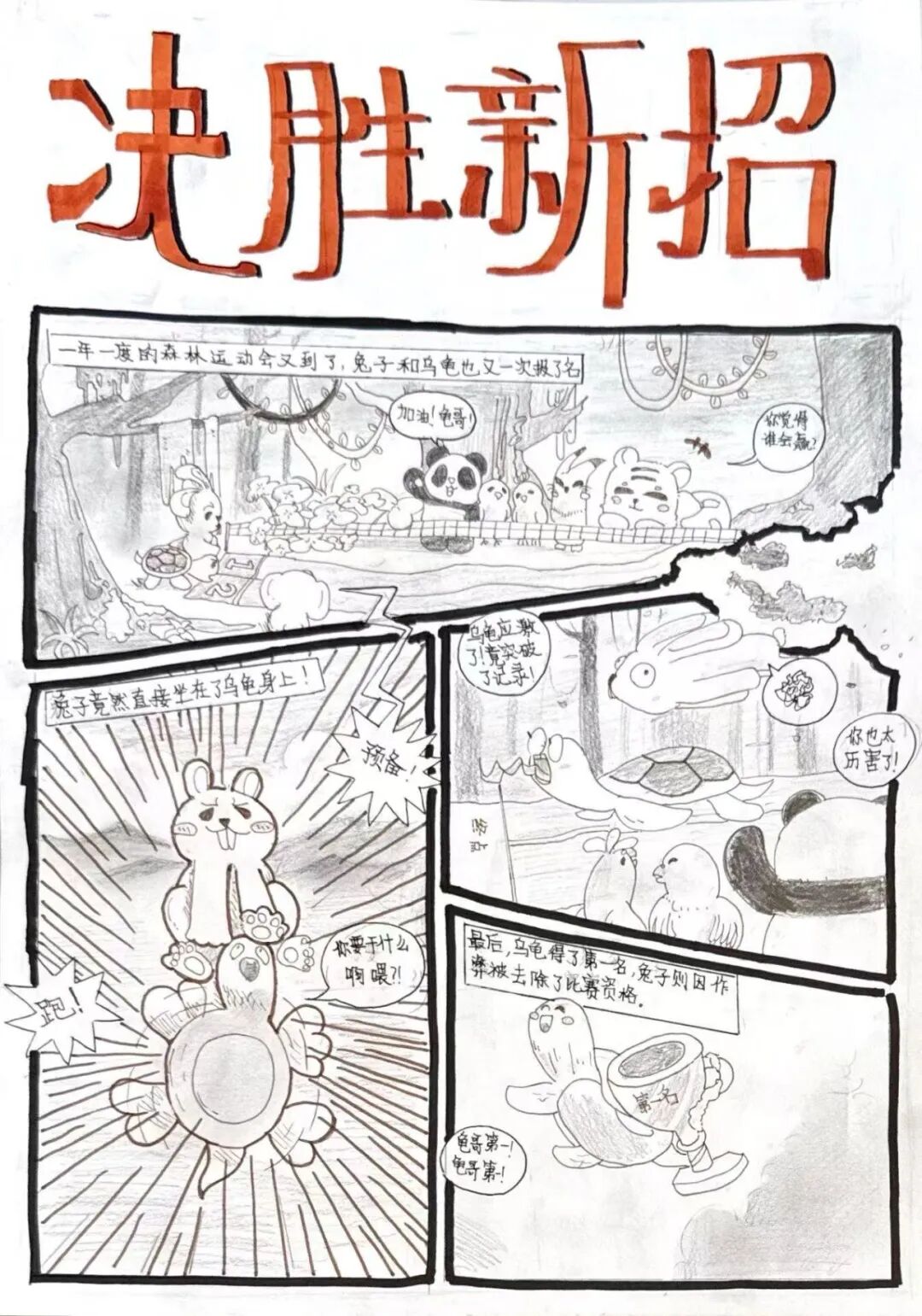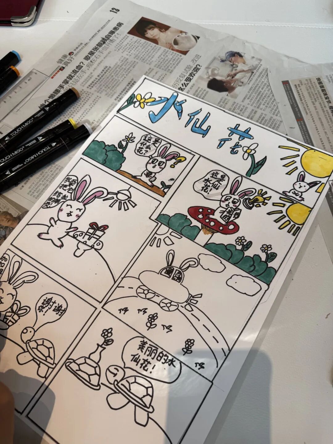 有的小画家抓耳挠腮,灵感忽隐忽现;有的则成竹在胸,下笔如有神。一个个奇思妙想的故事在画纸上诞生:有新编龟兔赛跑,有时尚的都市兔子,有穿越到古代的兔子......他们将上午的所见所闻、所感所想,都融入到了这小小的四格漫画中,用自己独特的视角和绘画风格,诠释对华老作品的理解和对漫画的热爱。