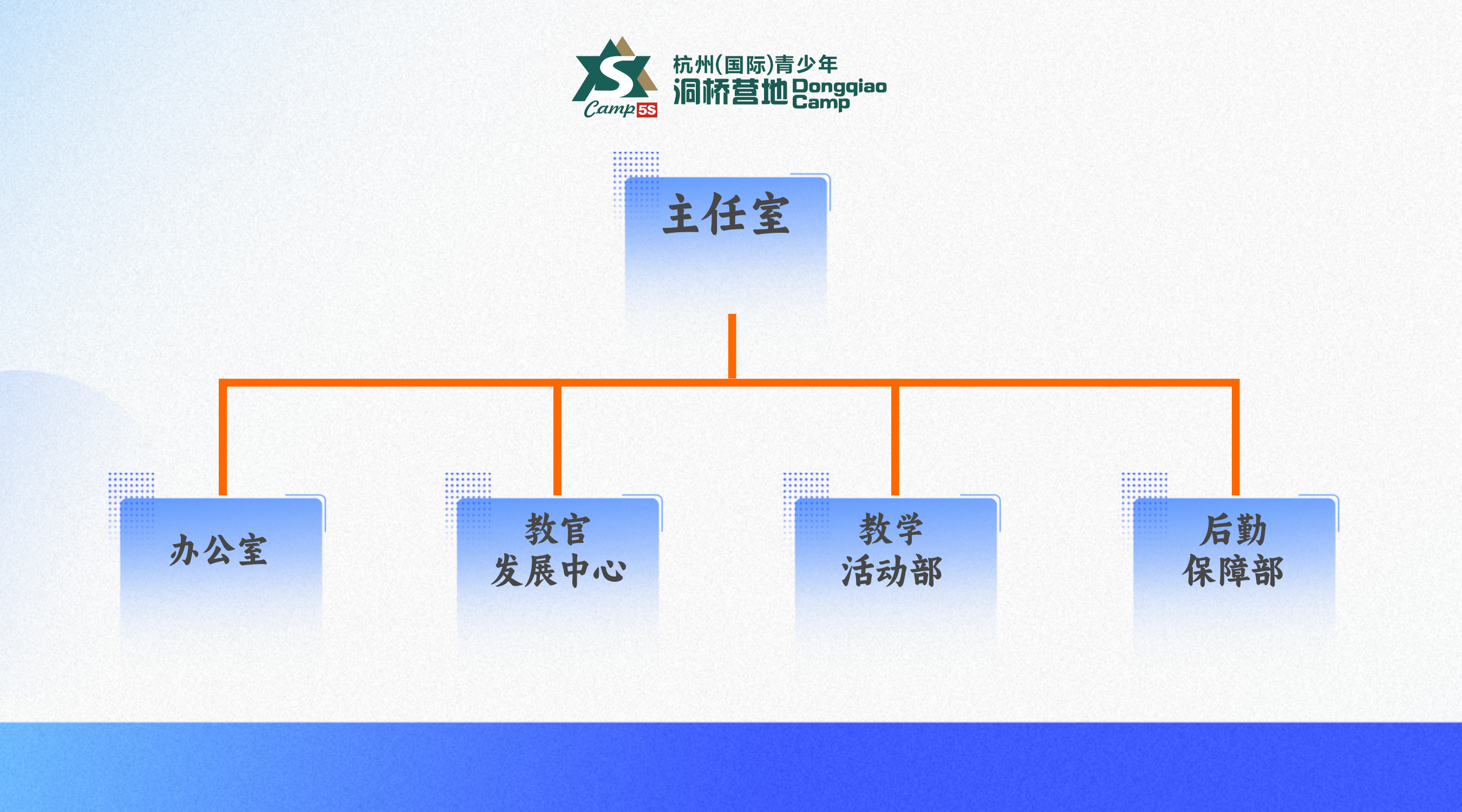 杭州(国际)青少年洞桥营地(简称“营地”)设立四个部门:办公室、教官发展中心、教学活动部及后勤保障部。